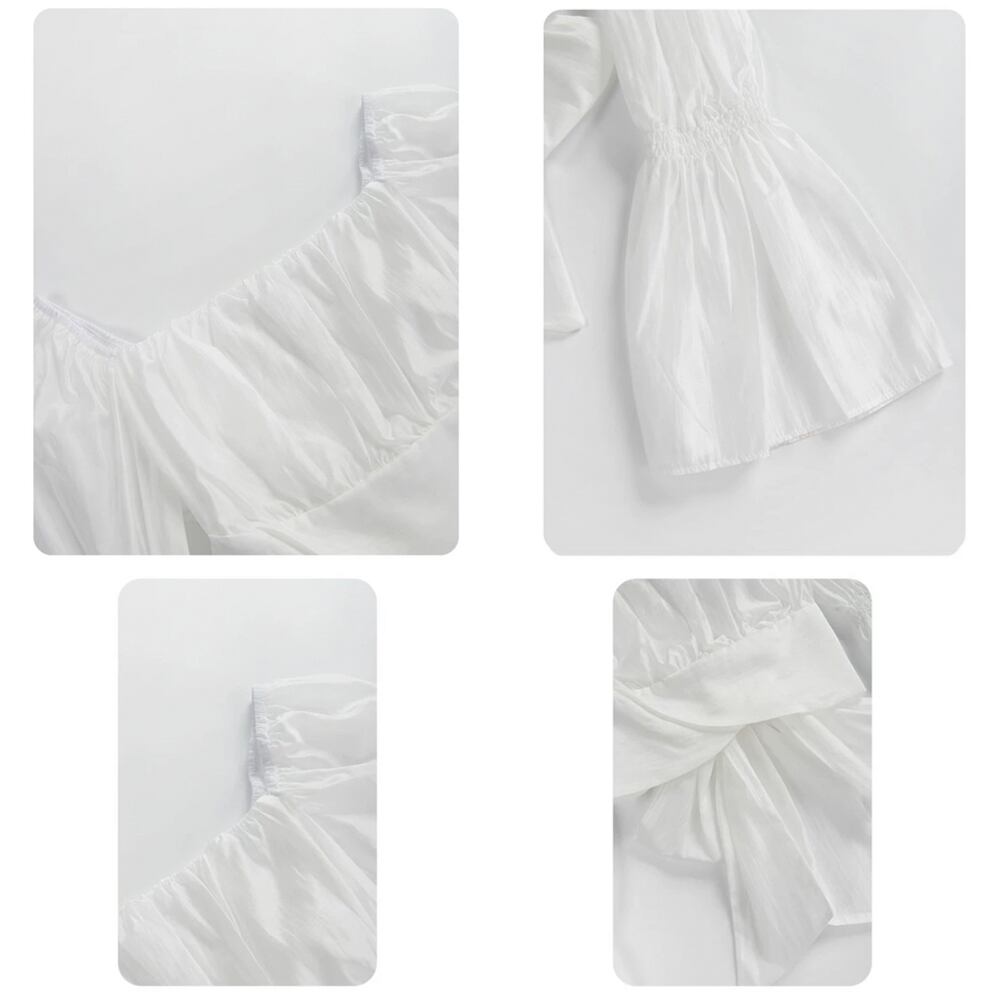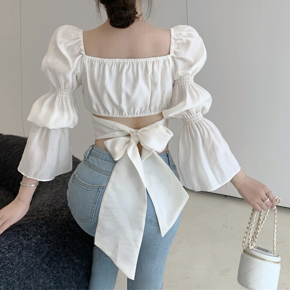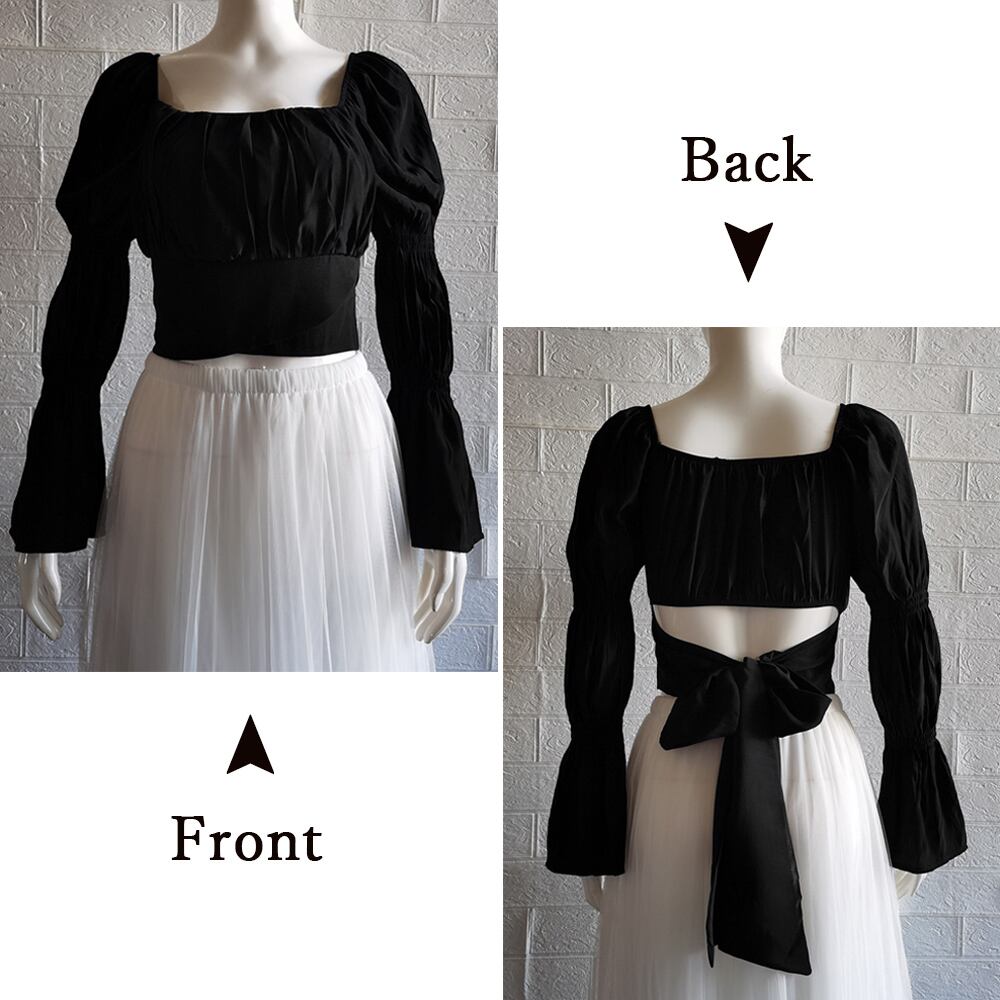 オープンバック仕様にリボン結びデザインがセクシーで可愛いパフスリーブ袖トップス