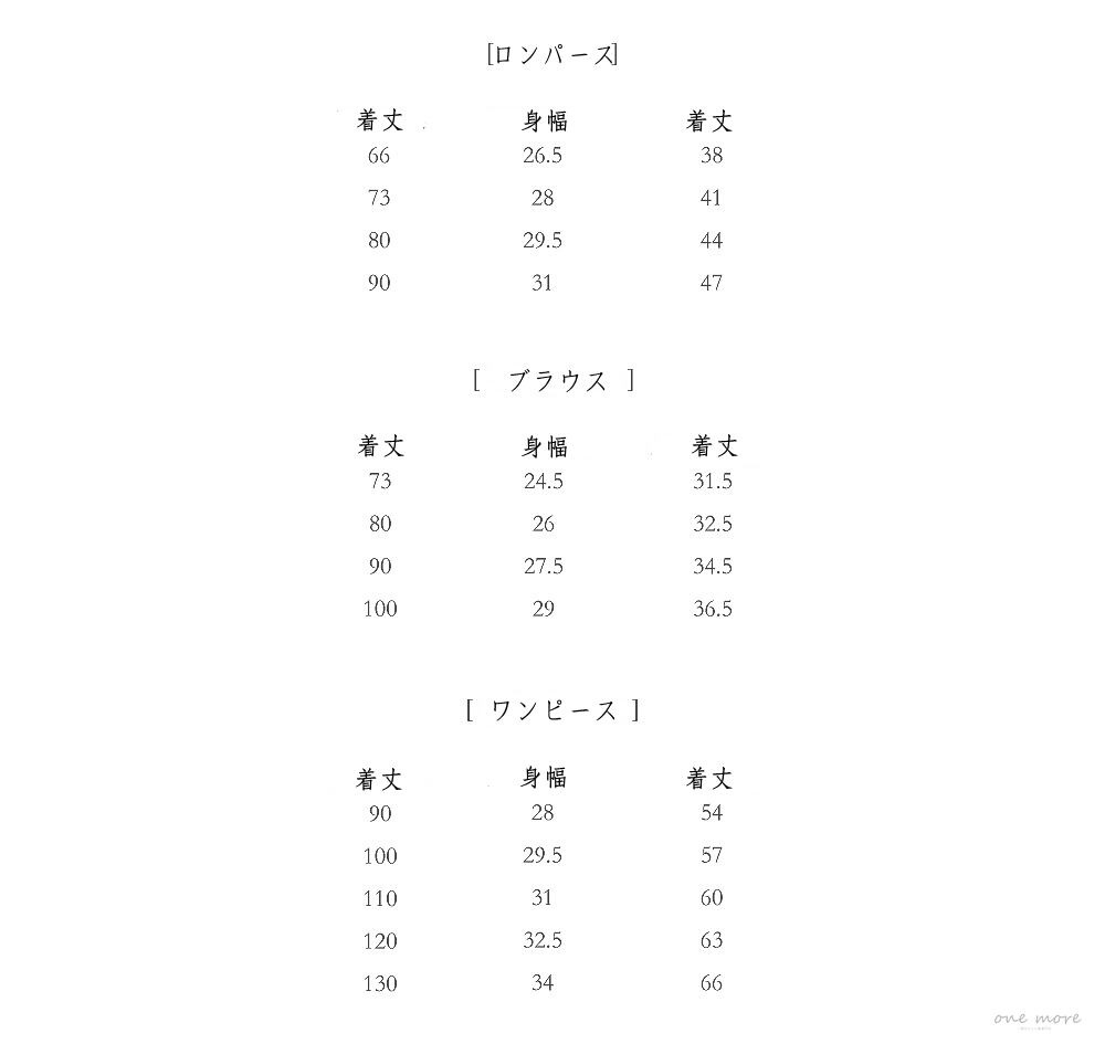 サイズ:(cm)ロンパース/66〜90cm ・ シャツ/73〜100cm ・ ワンピース/90〜130cm