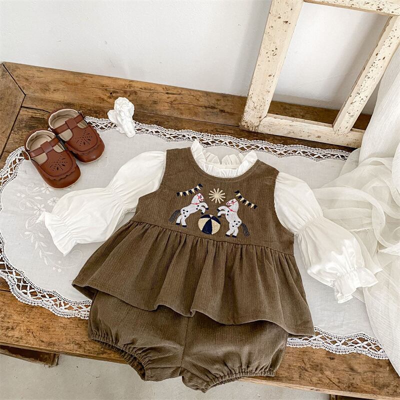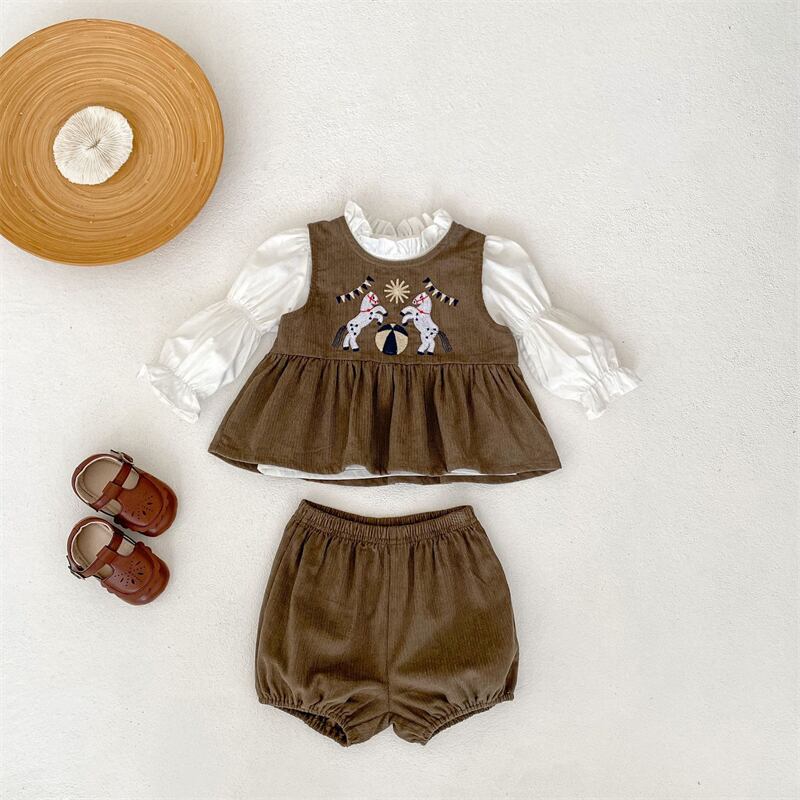 【海外からの取り寄せ】ins 秋新作 子供服 女の子 コーデュロイ セットアップ 刺繍ベスト ハーフパンツ 長袖シャツ 可愛い #[ckd1094043_30900]【送料込み】【251111】