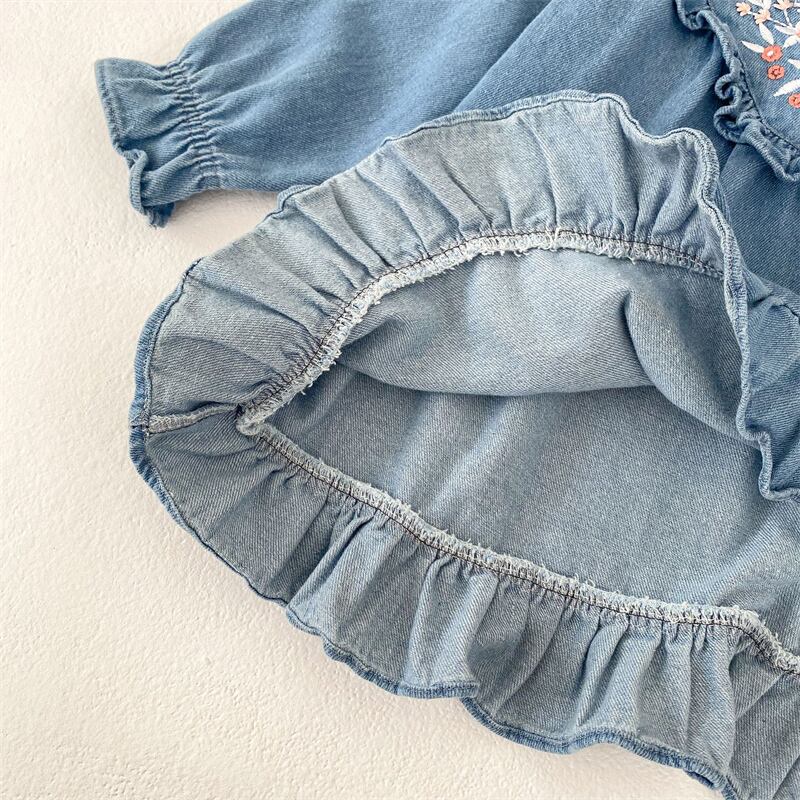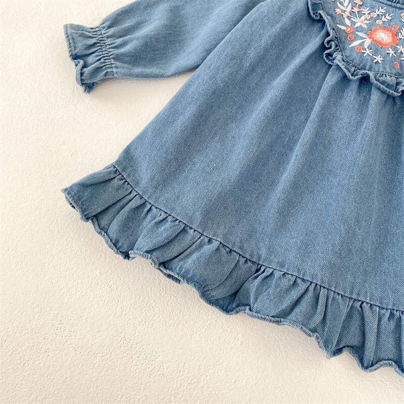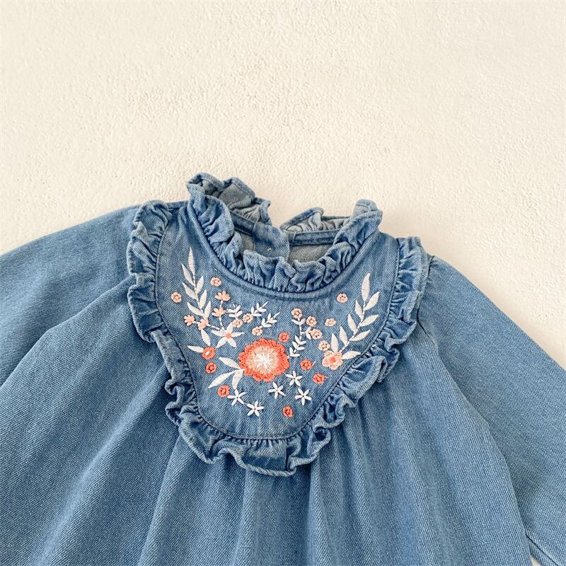 【海外からの取り寄せ】2024秋新作 子供服 女の子 デニム 長袖 ワンピース 立ち襟 可愛い おしゃれ 刺繍花柄 フリル #[ckd1094090_21800]【送料込み】【250503】