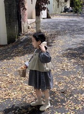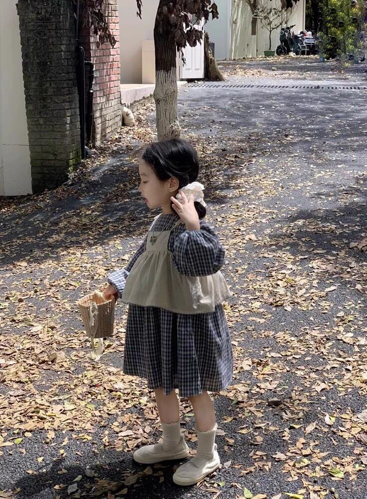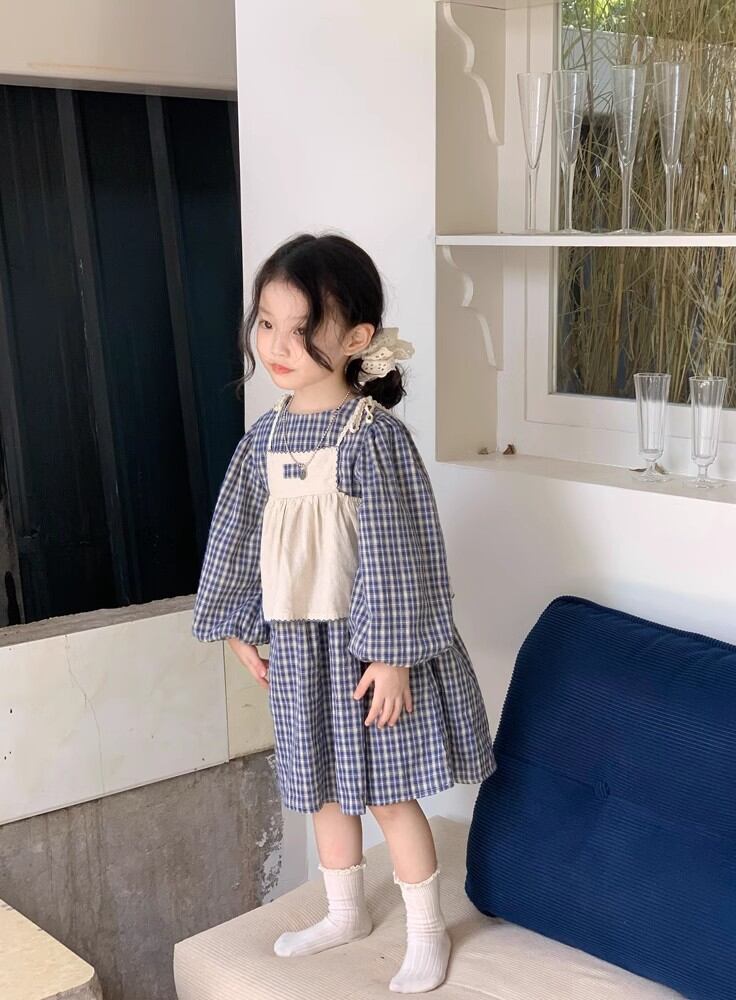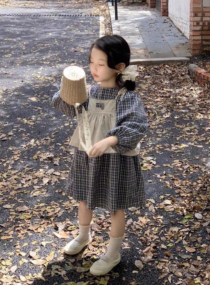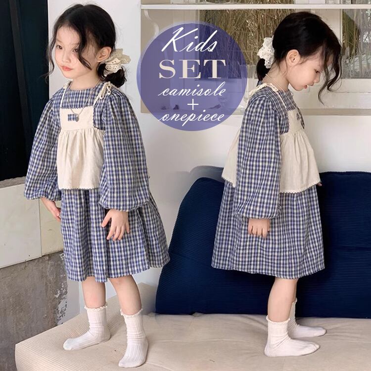 【海外からの取り寄せ】 2024新作 韓国子供服 子供 キッズ セット ワンピース 長袖 チェック柄 ネイビー キャミソール #[kids777_23800]【送料込み】【250429】