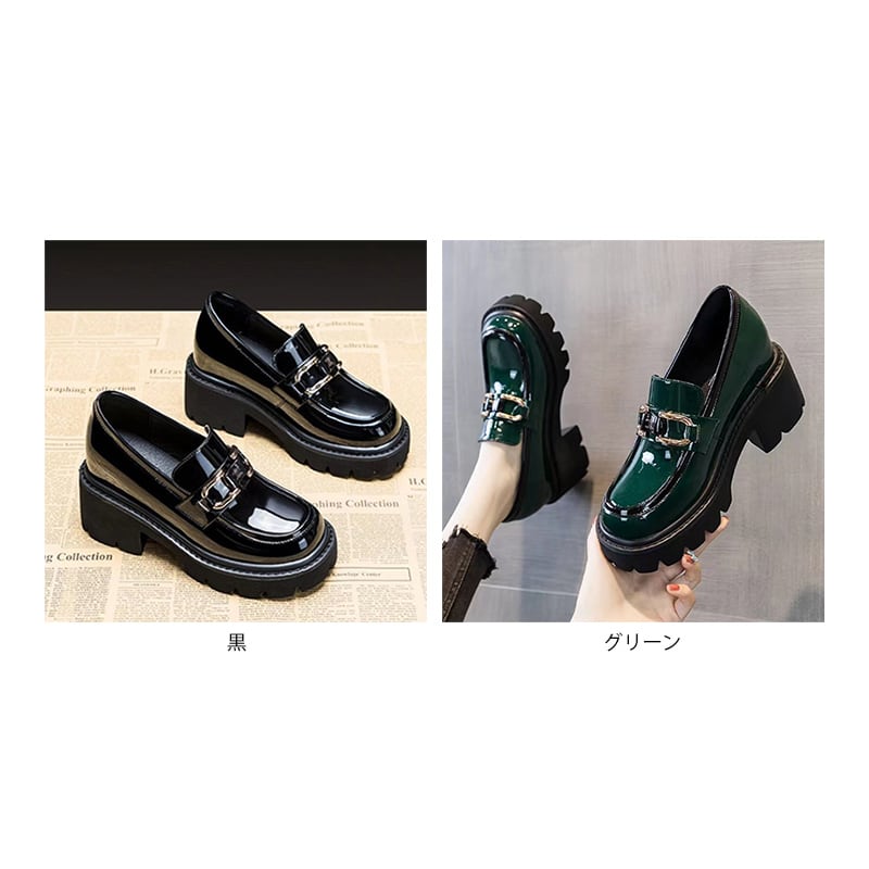 【海外からの取り寄せ】 2024新作 レディース ローファー パンプス 光沢 艶感 金具 厚底 黒 グリーン 美脚 脚長 #[pumps307_23800]【送料込み】【250907】