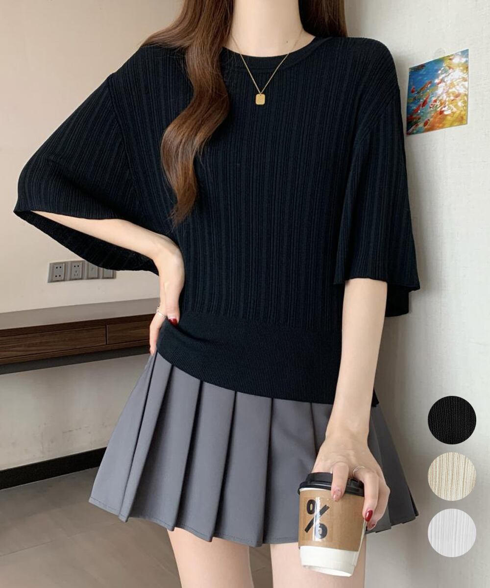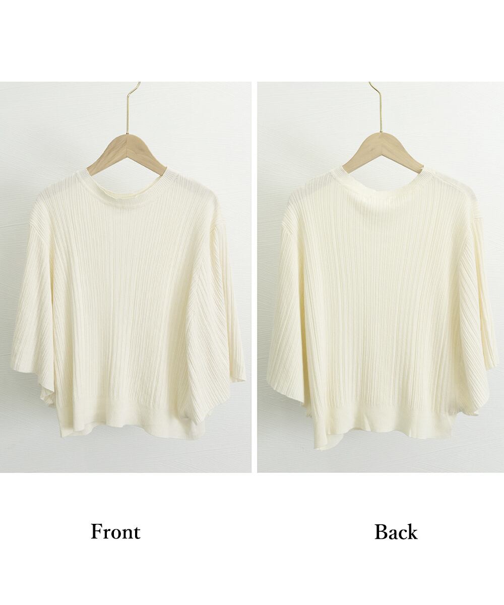 半袖サマーニット 冷感タッチ ニットブラウス 上品きれいめ ニットTシャツ オフィスカジュアル 華奢見えドルマンスリーブ