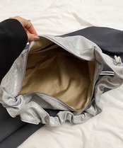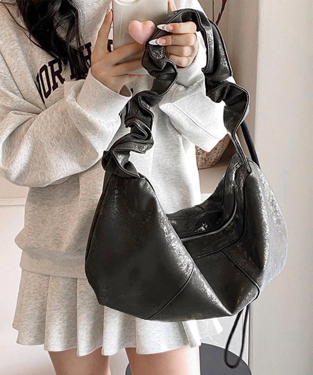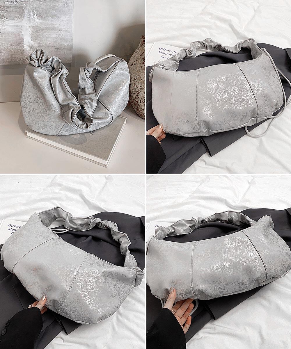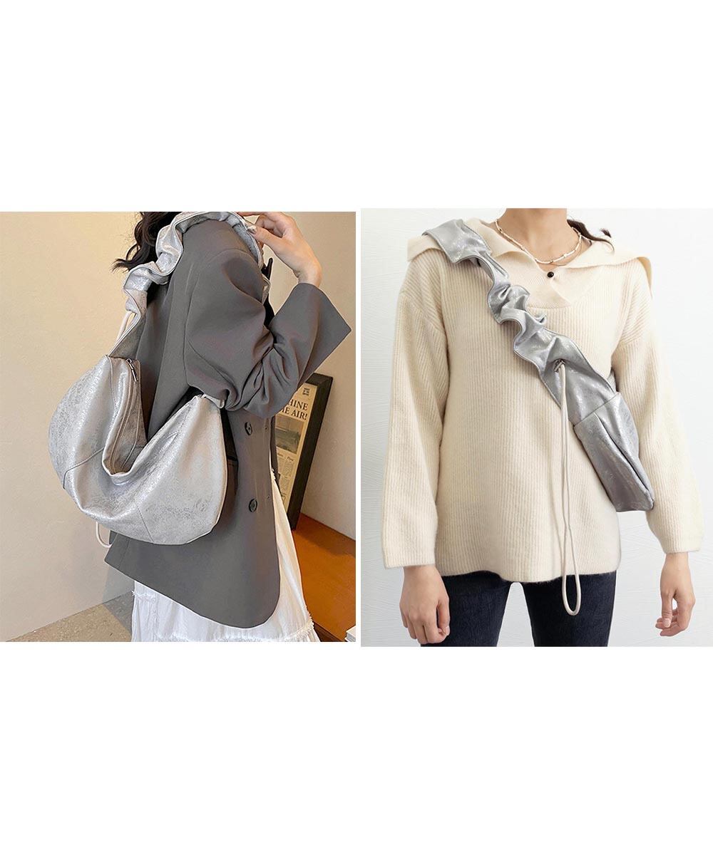 フリルハンドル ワンショルダーバッグ 大容量 ドロストボディバッグ 肩掛けかばん PUレザー軽量 シルバーバッグおしゃれ