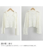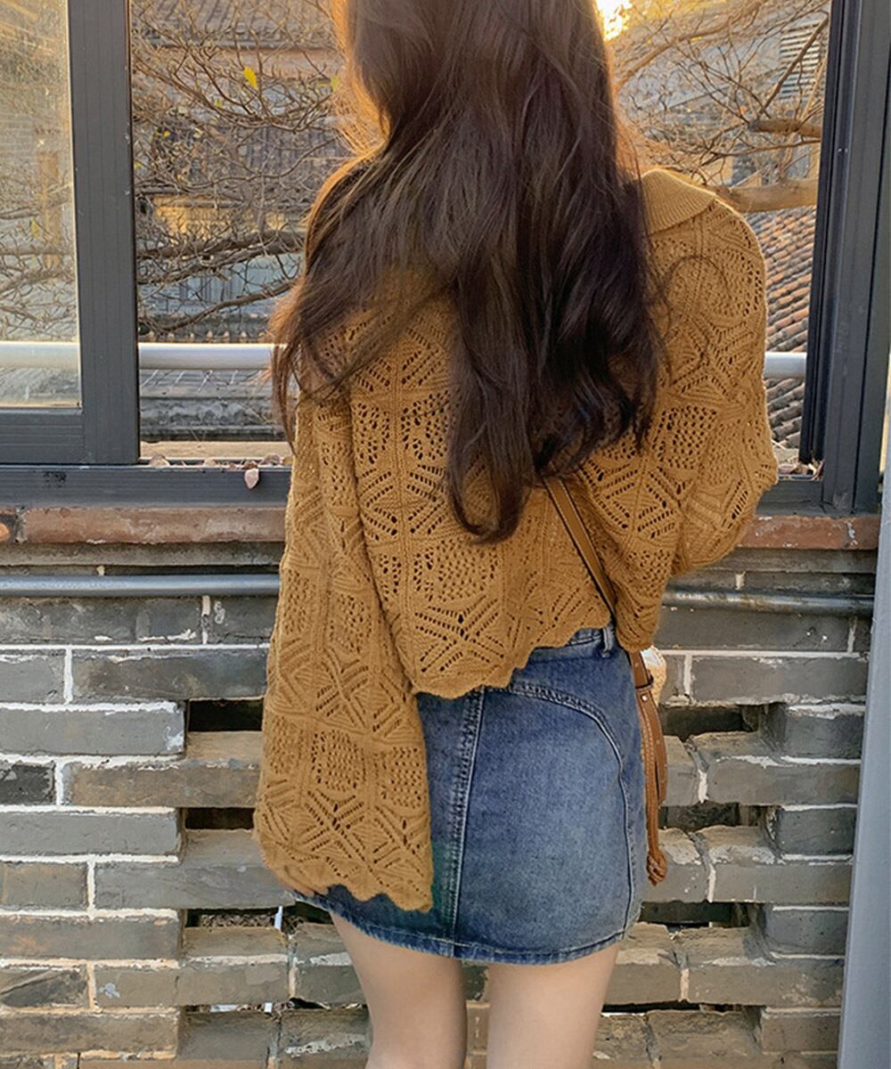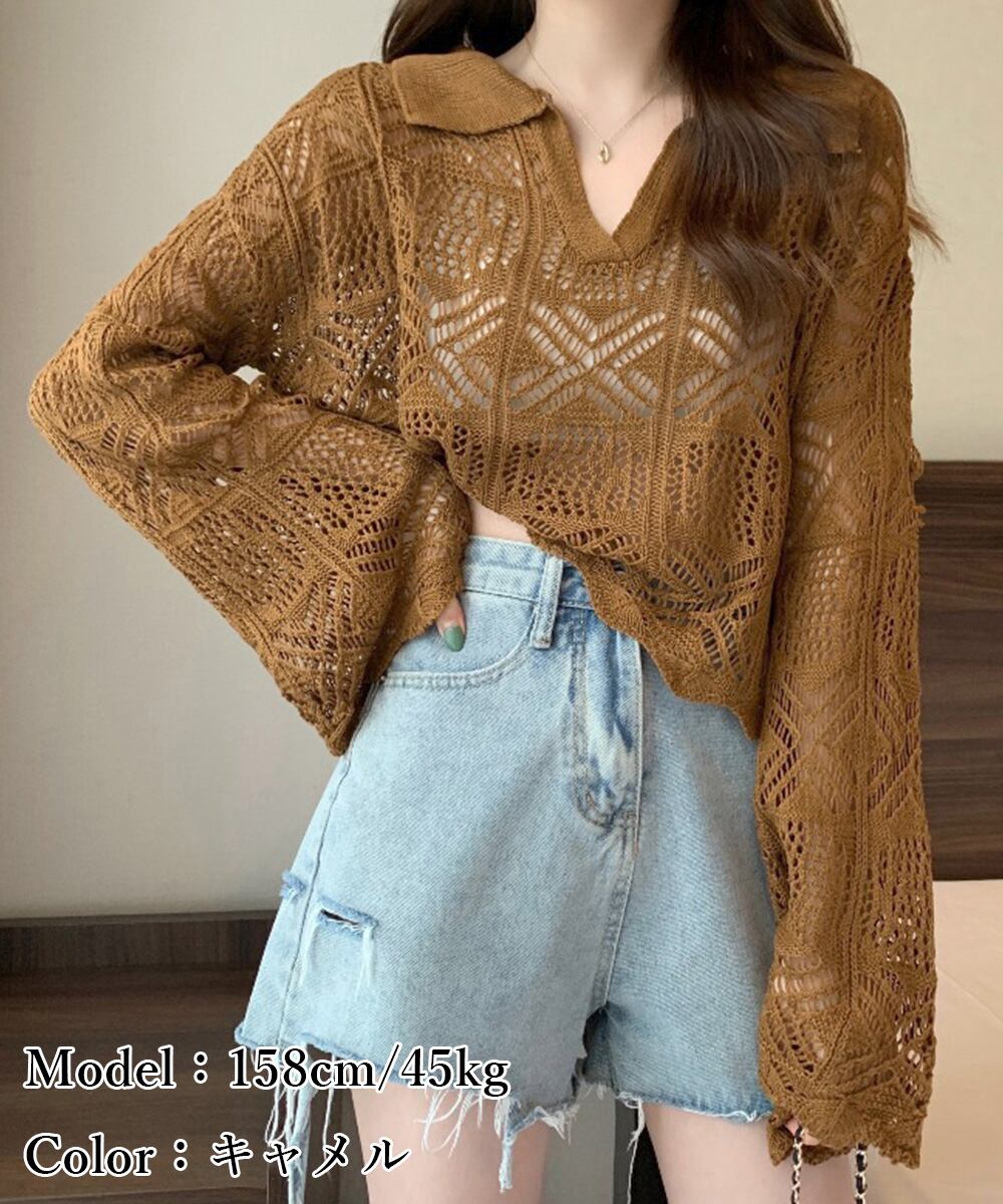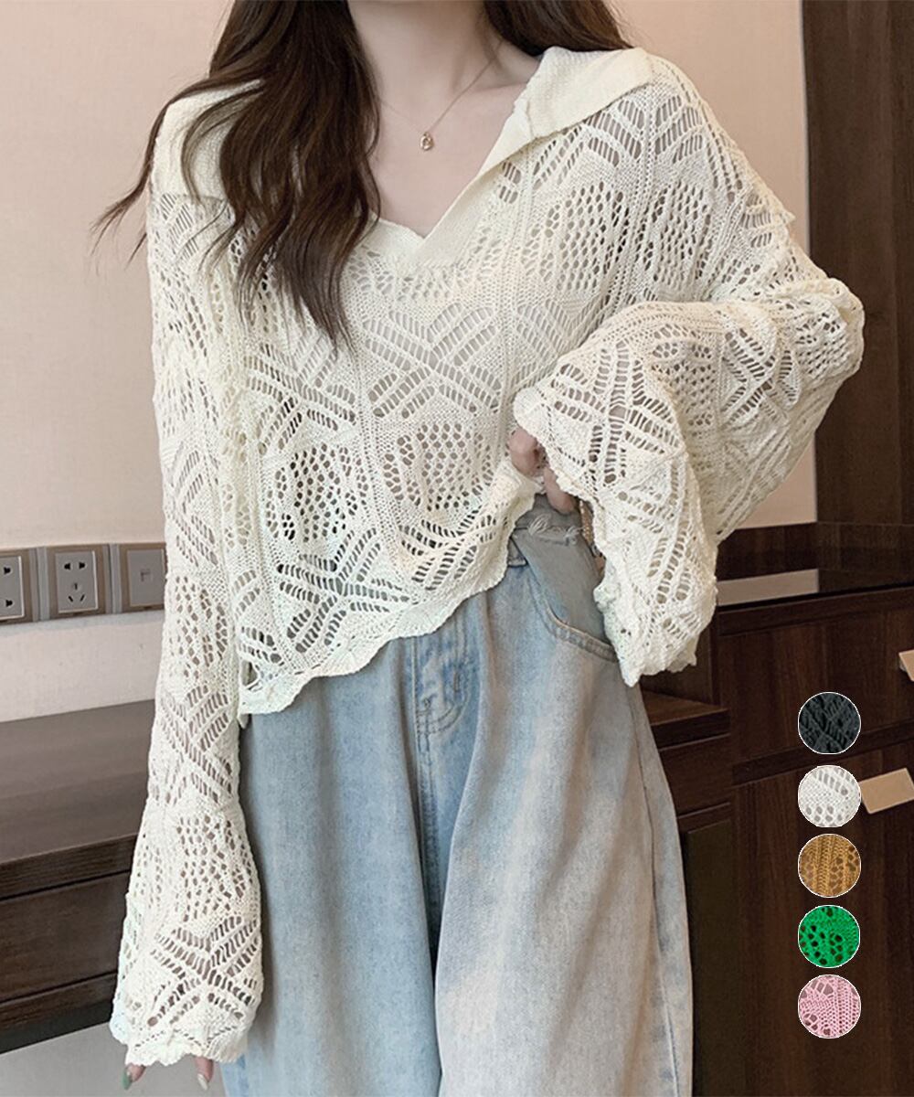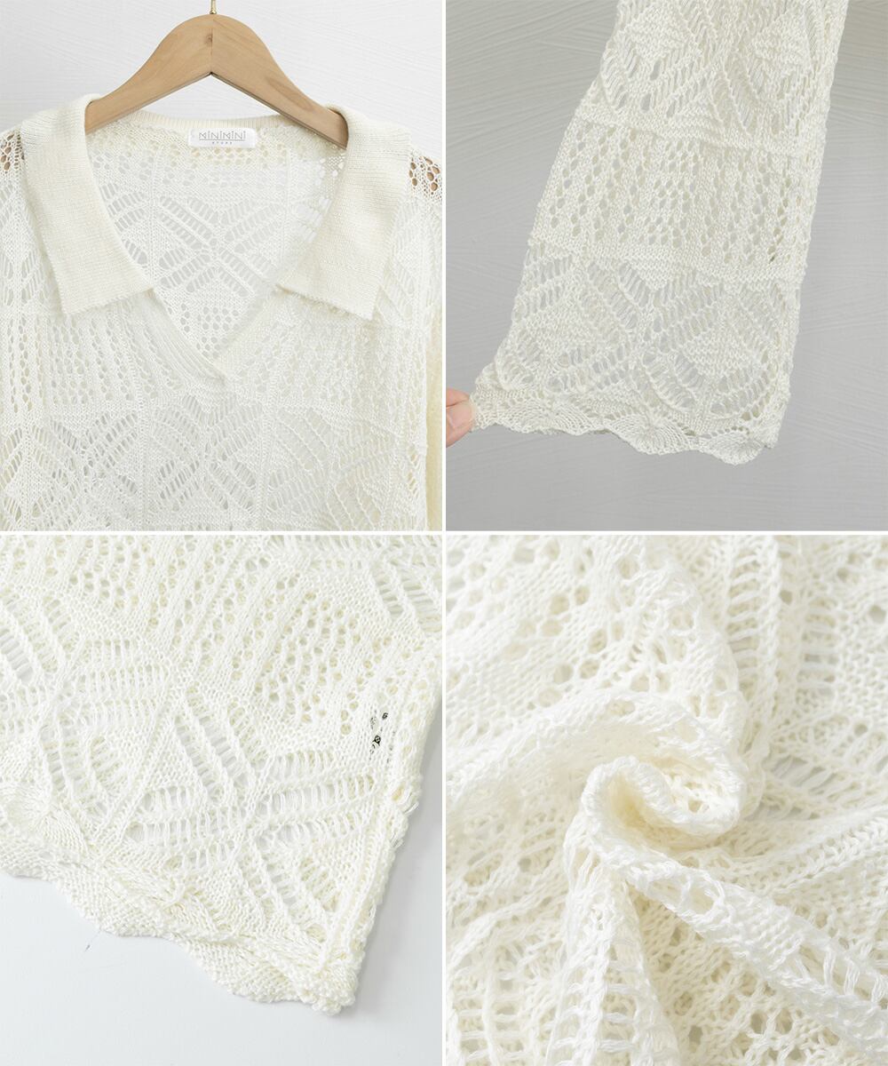 レディース クロシェ編み ポロニット 長袖ショート丈ニット オープンカラーメッシュ編み 襟付きニットプルオーバー春夏秋服