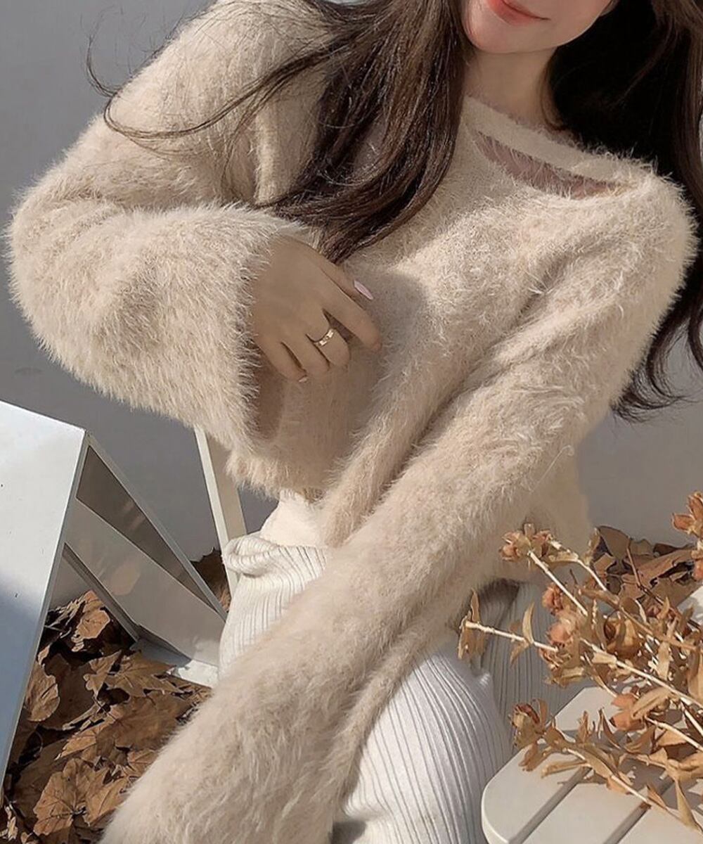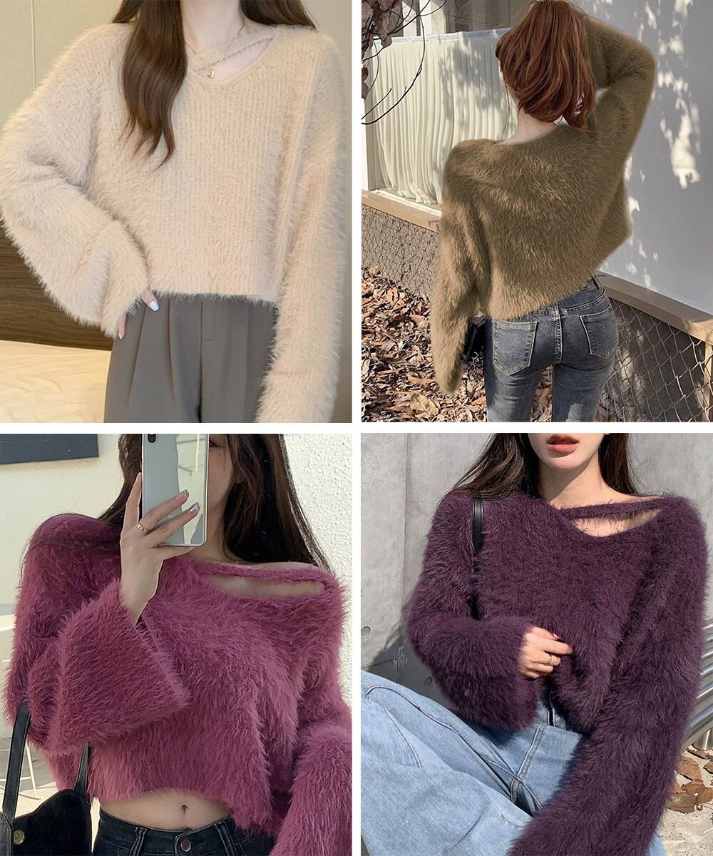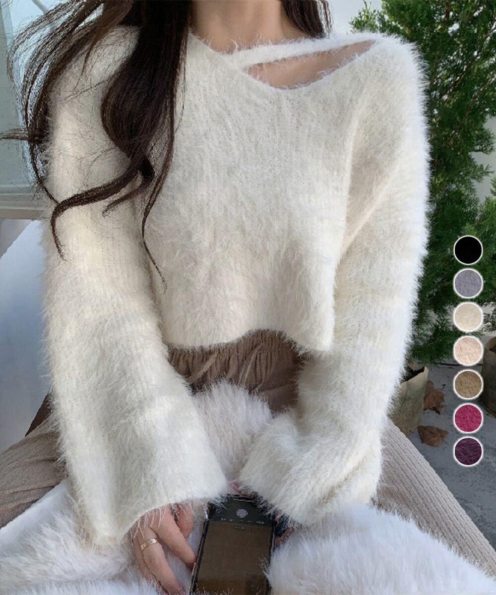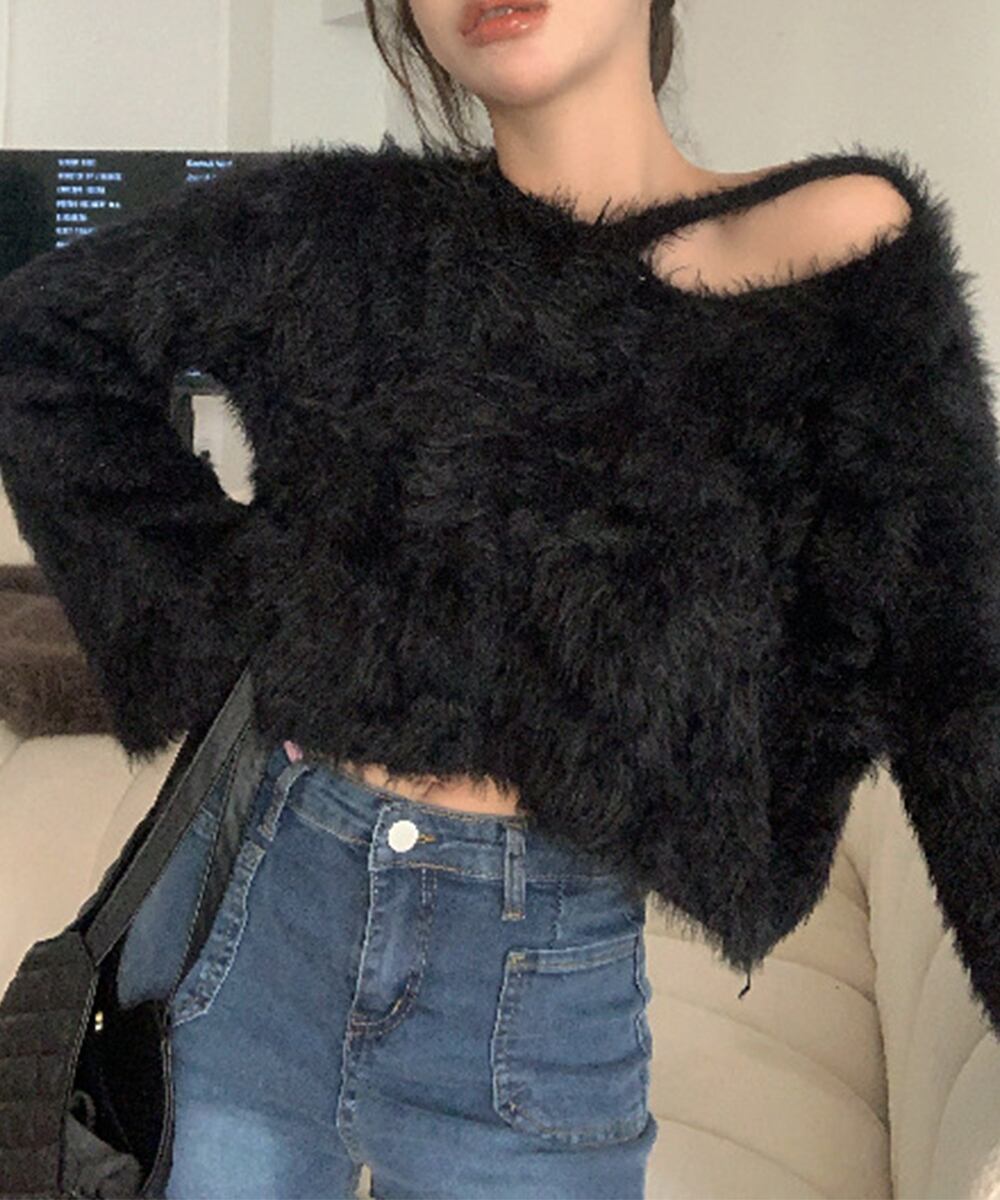 ふわふわ ショート丈ニットトップス アシメトリーネック モヘアニットプルオーバー 秋冬シャギーセーター セクシー 韓国風
