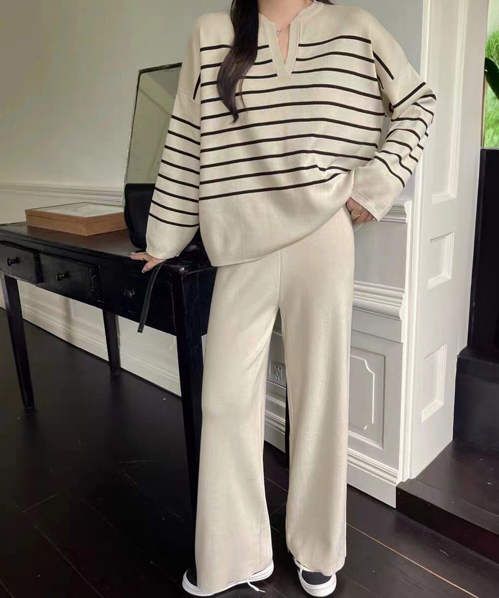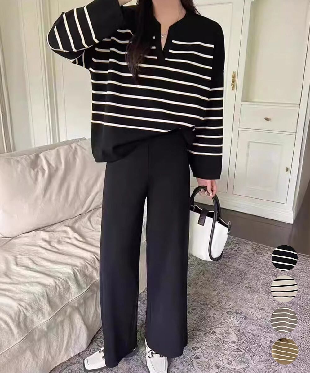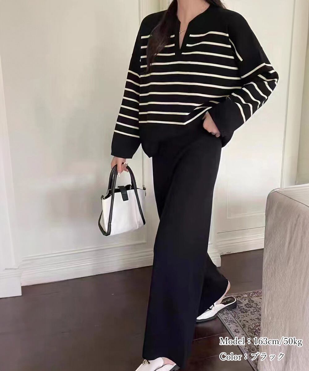 レディース スリットネック ボーダーニットトップス セミワイドパンツ上下セット ゆったり らくちん ニットパンツ 韓国風