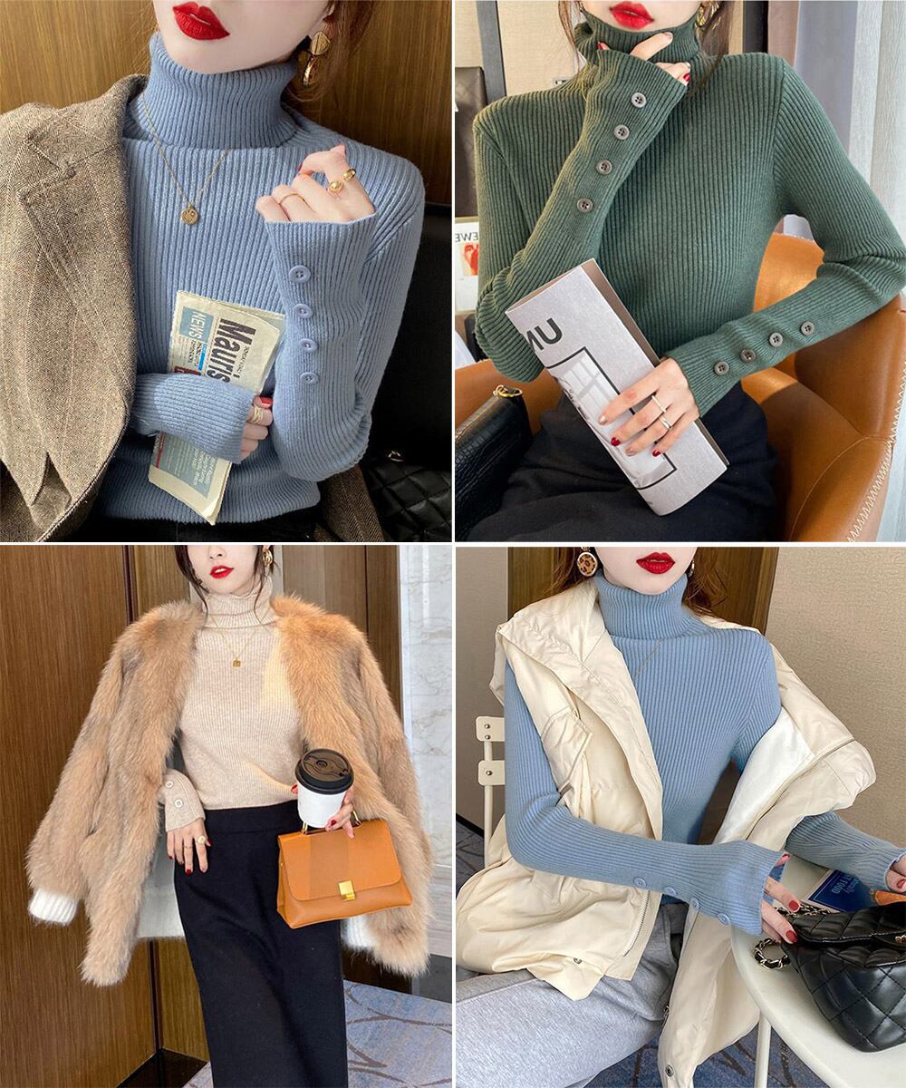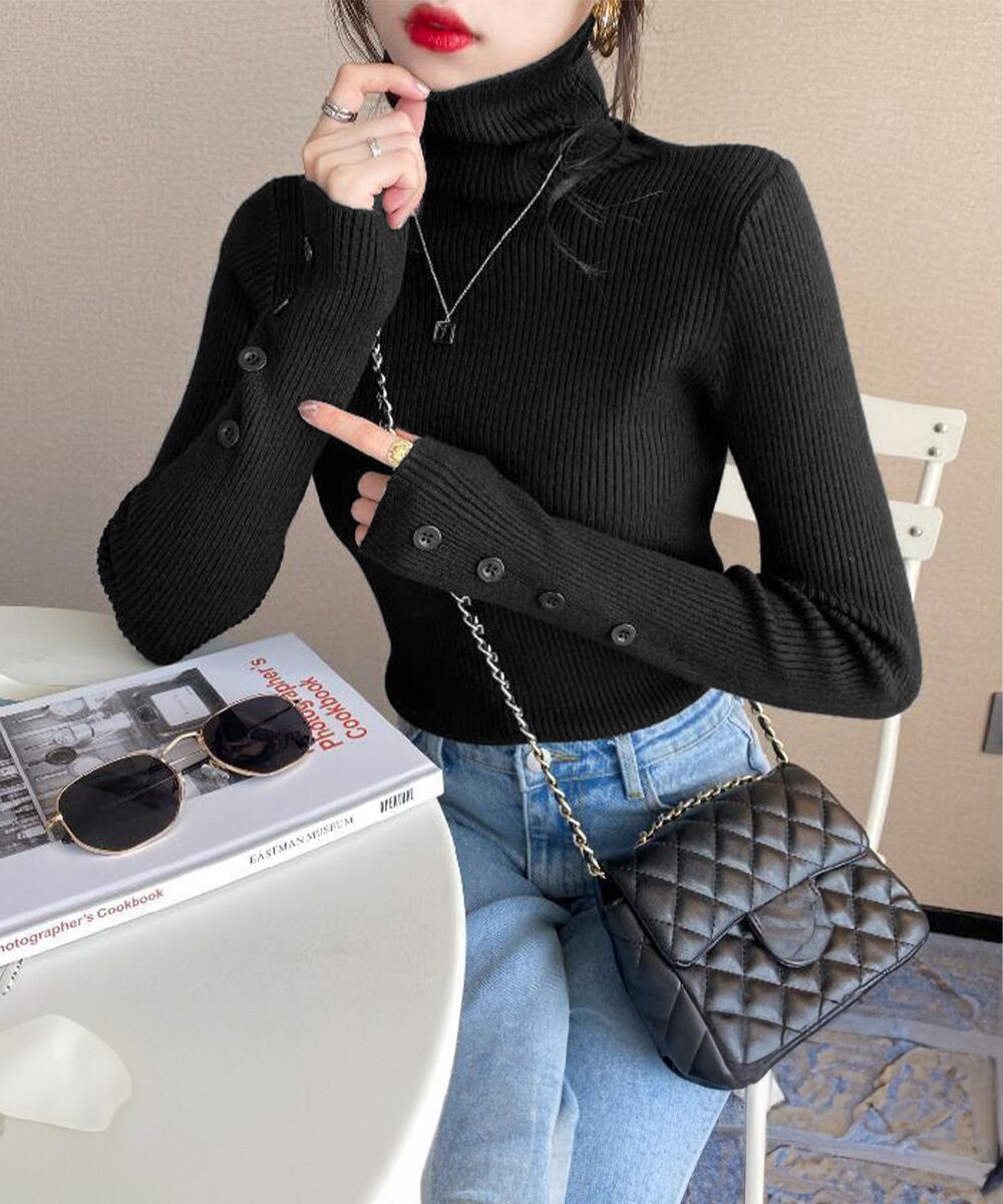 袖ボタンがカワイイ、ハイネックリブニットトップスが新登場!