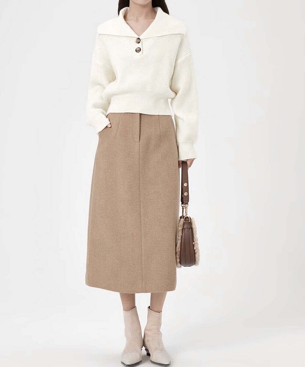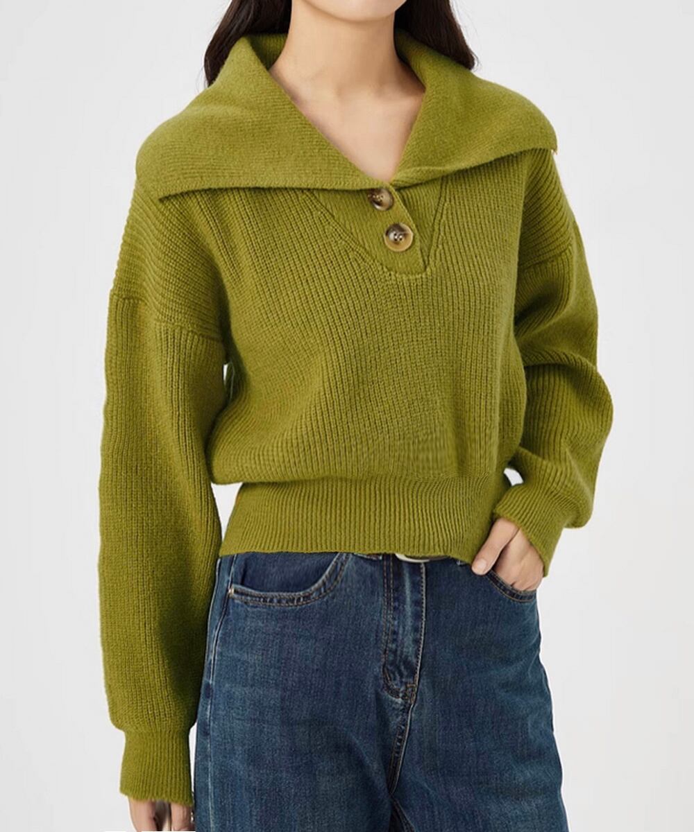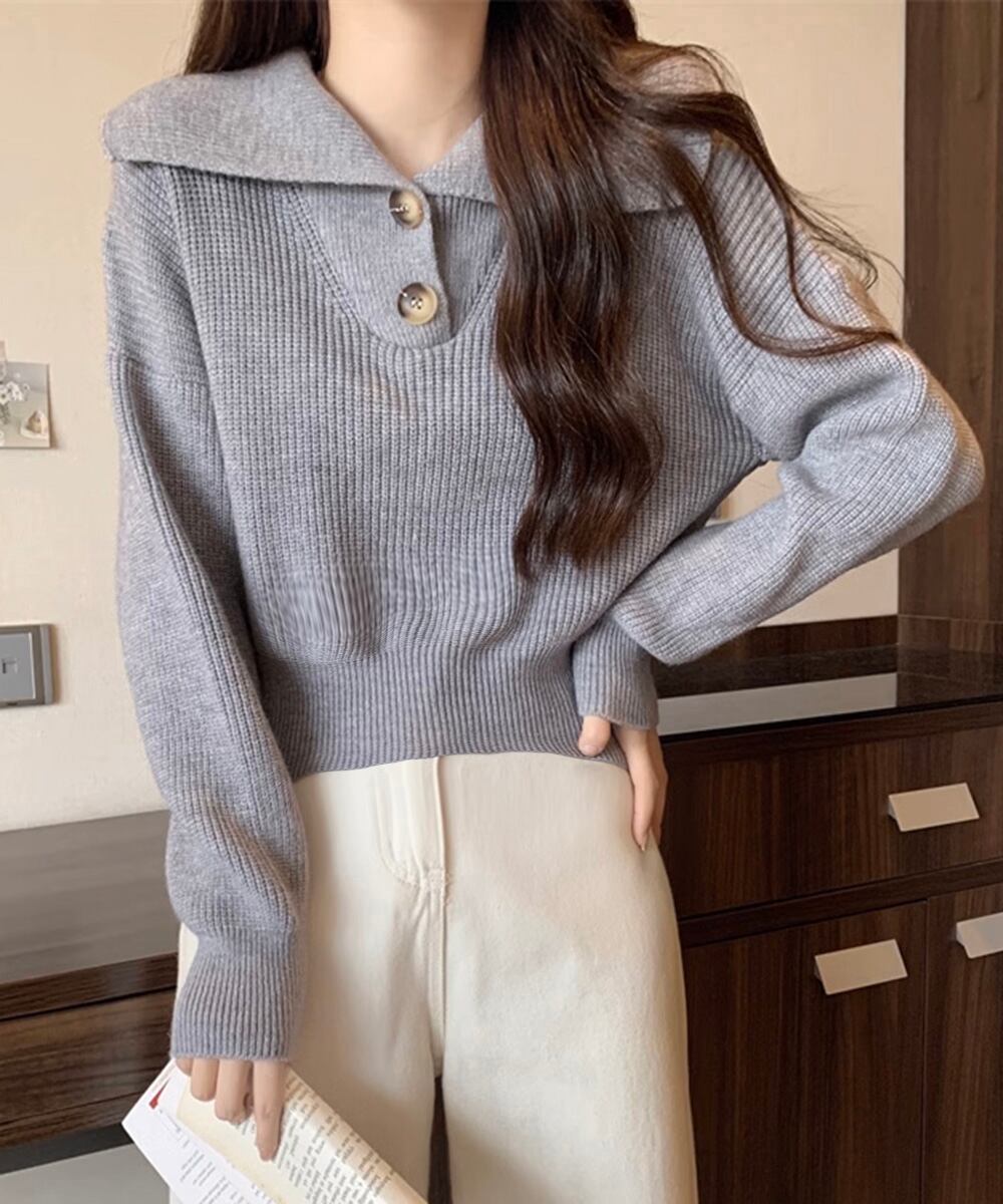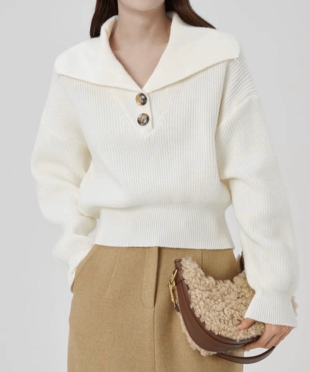 存在感のある大きめの襟が目を引き、トレンド感満載のニットトップスです。