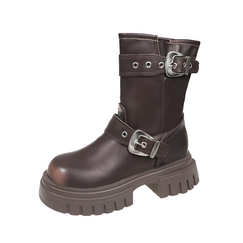 ・レトロ感のあるダメージ加工、ダブルベルトデザインが施されたミドルブーツ。