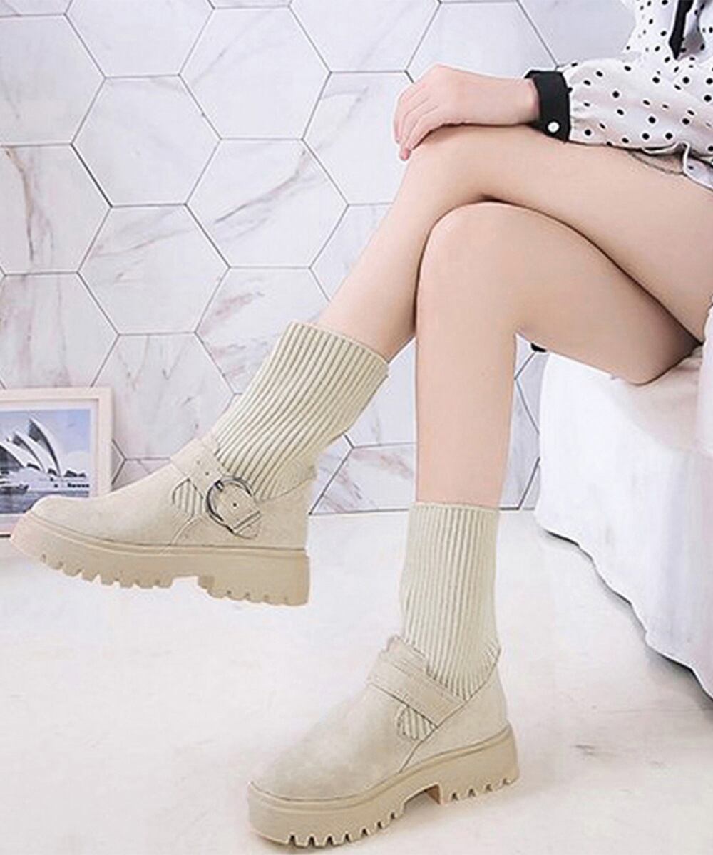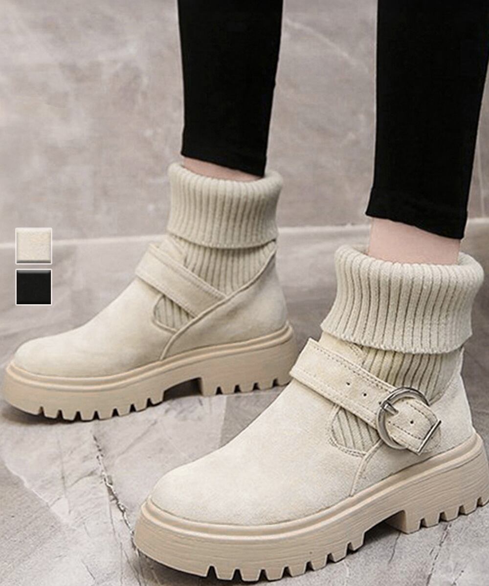 ソックス風 ショートブーツ レディース 2wayニットブーツ バックルベルト 厚底ブーツ 歩きやすい ハイカット