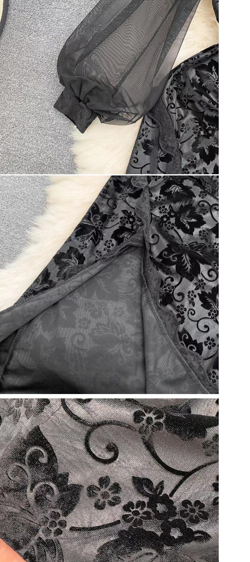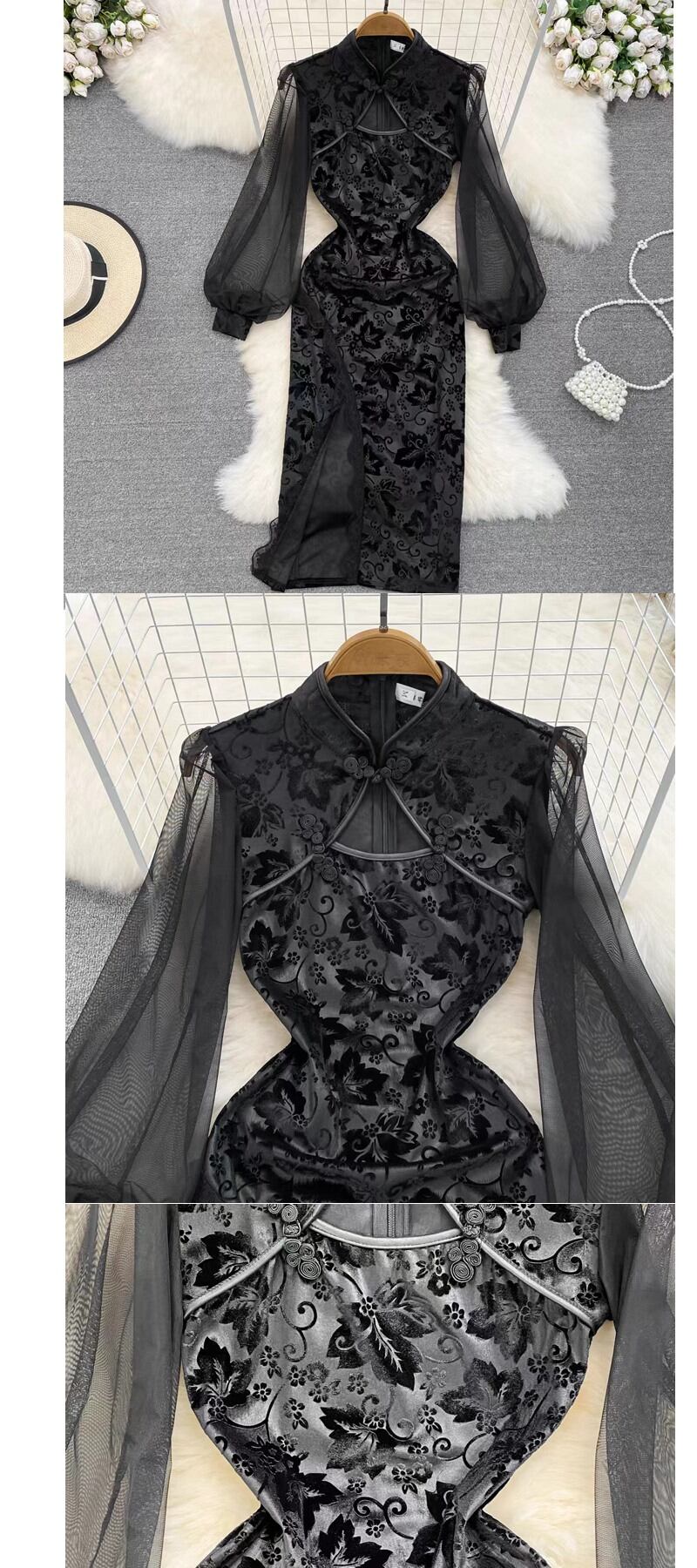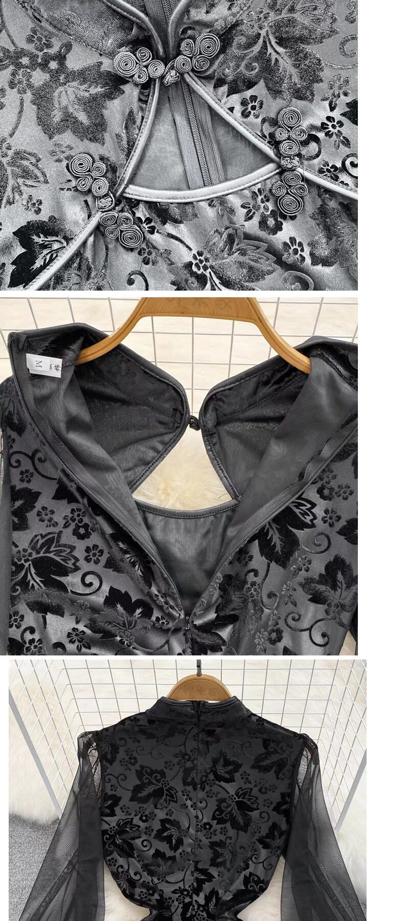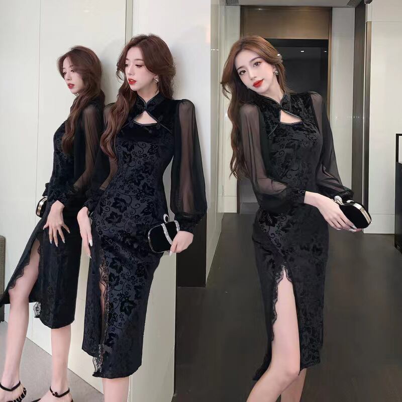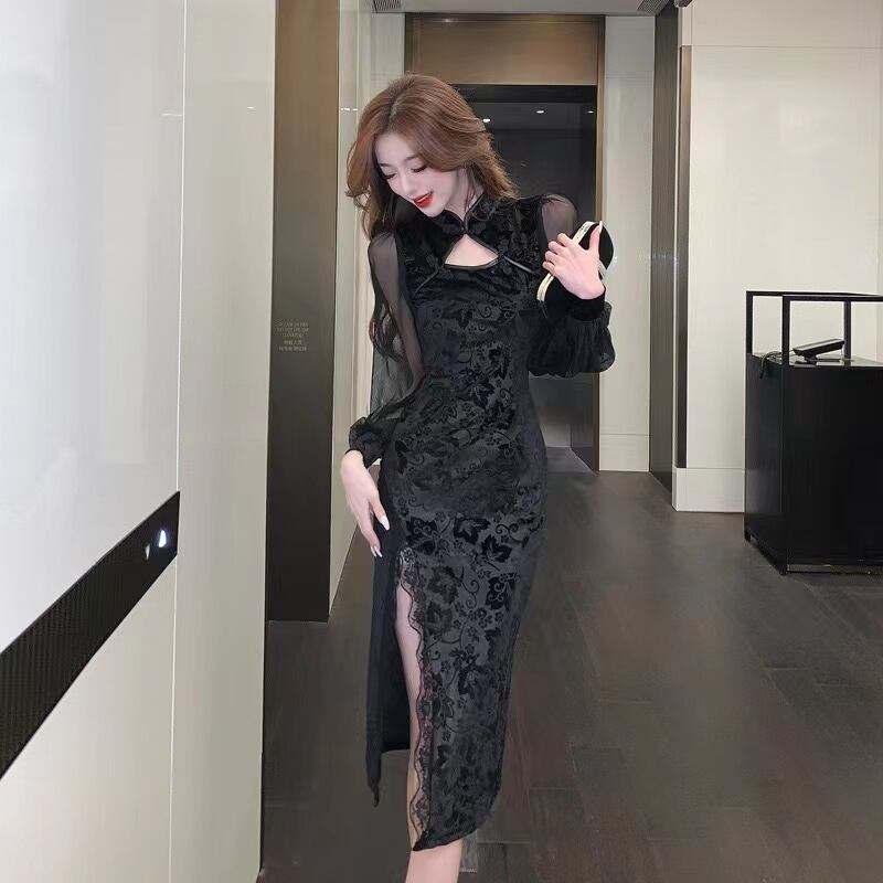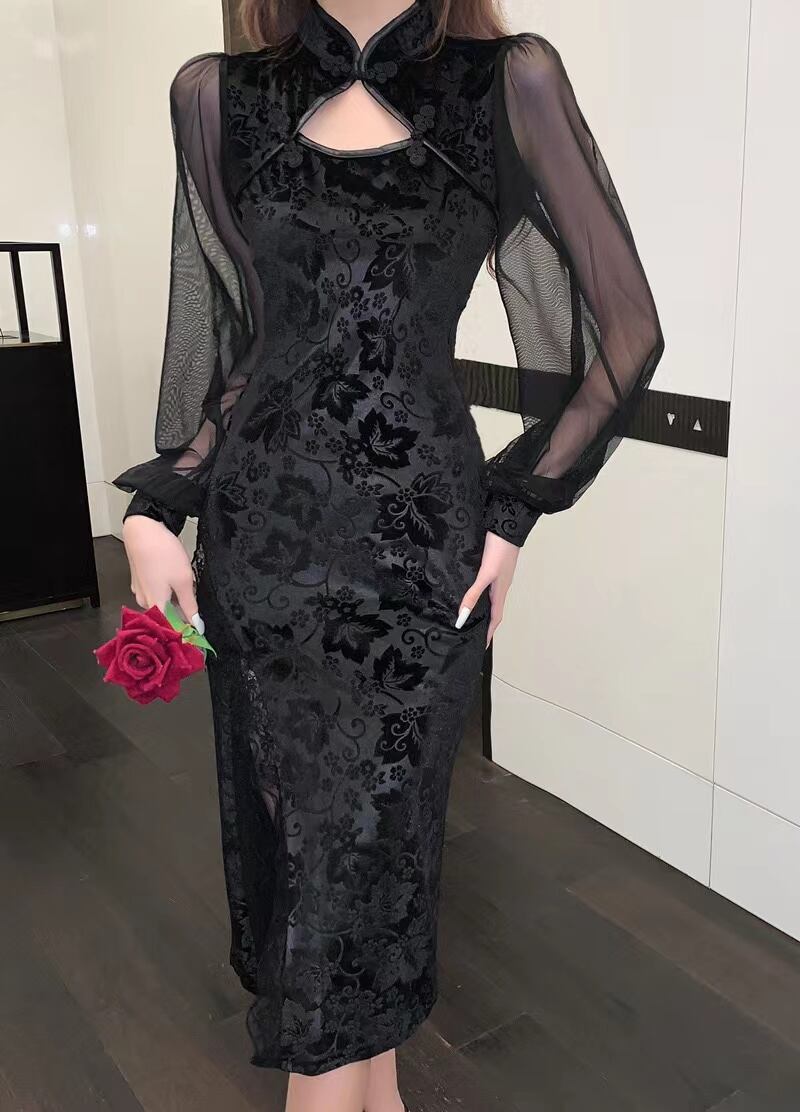 ネックのデザインが特徴的なセクシー黒地の花柄チャイナドレス♪光沢感あり、高級感が溢れるベロア生地の上質な大人のドレス!!脚魅せのハイスリットがセクシー◎すけすけレースの袖も魅力的♪着心地がいい、ストレッチも効いて楽ちん。ボディラインを美しく見せる大変綺麗なドレスです。