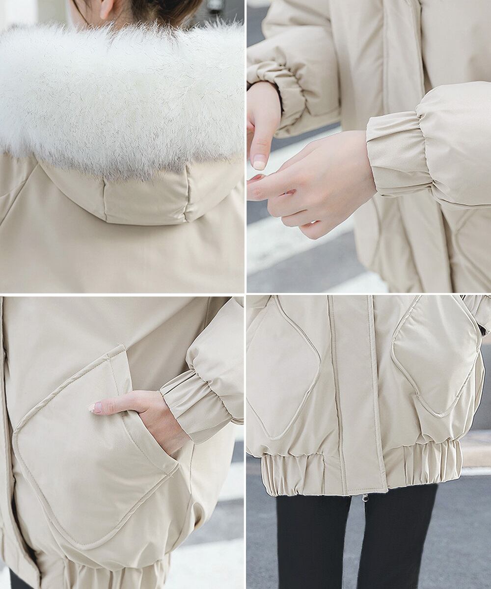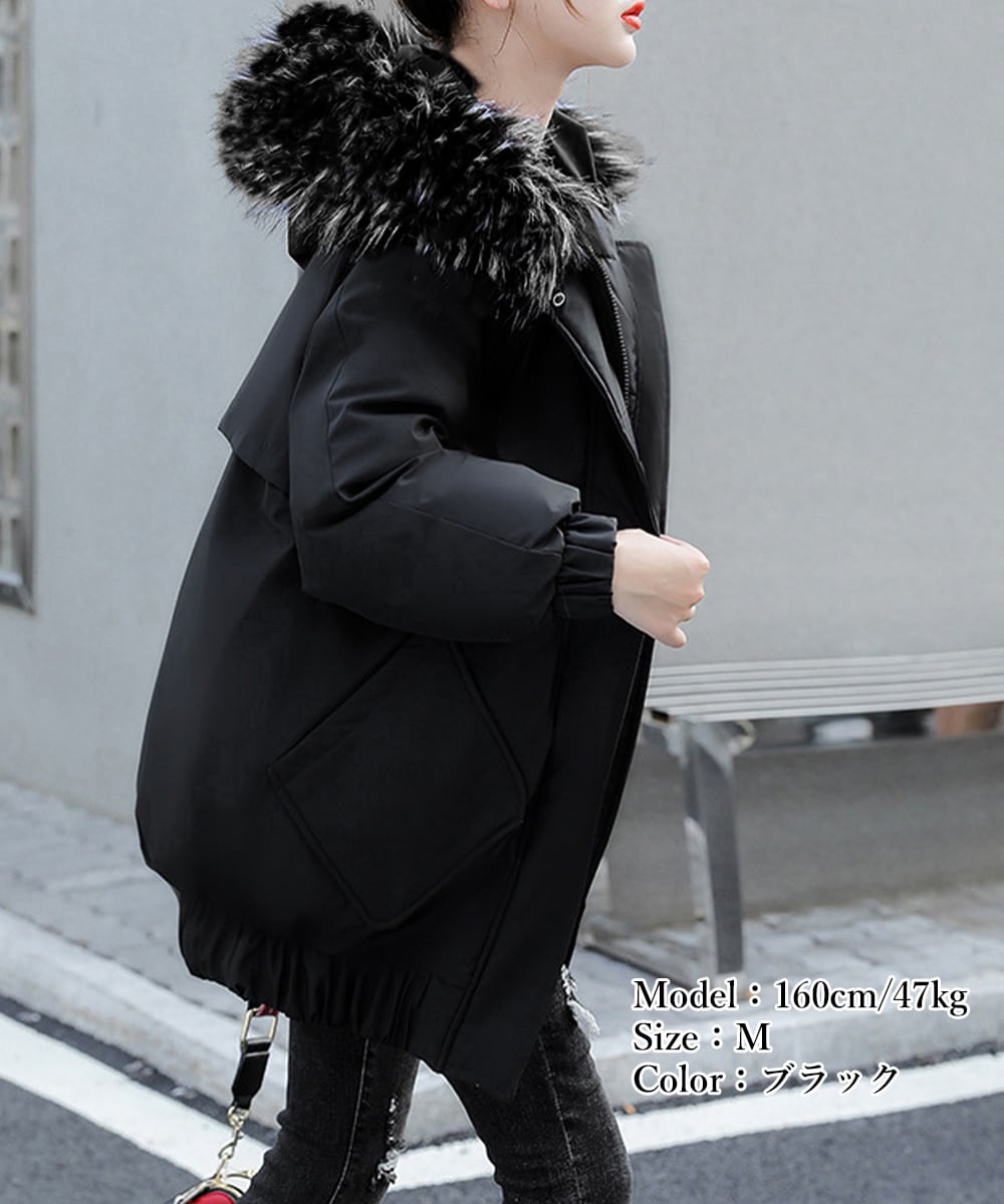 ふわふわとしたフェイクファーがフードに付いており、首元をしっかりとカバーしてくれるミドル丈のフェイクダウンジャケットです。