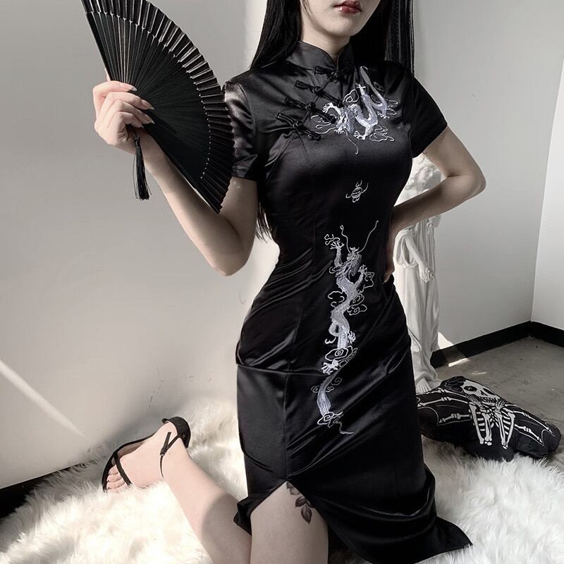 ししゅうの龍柄デザインが特徴的、脚魅せのハイスリットがセクシー◎