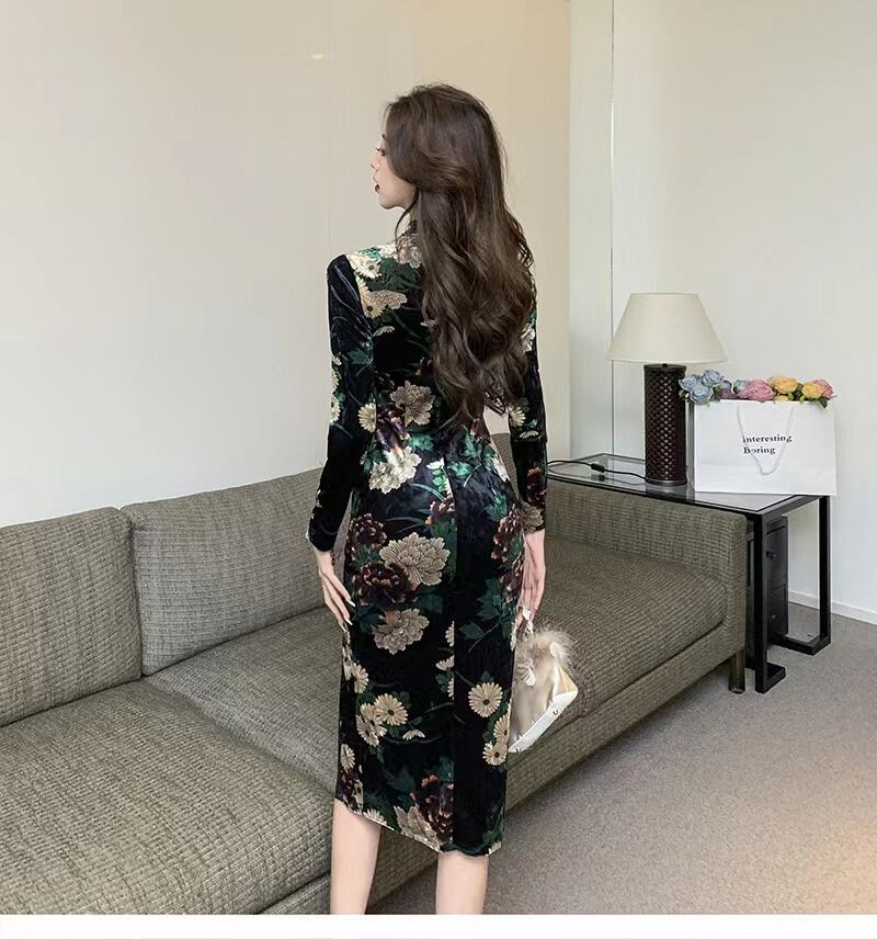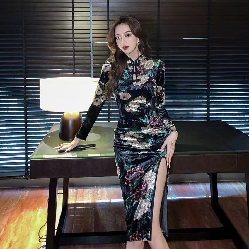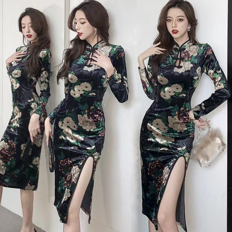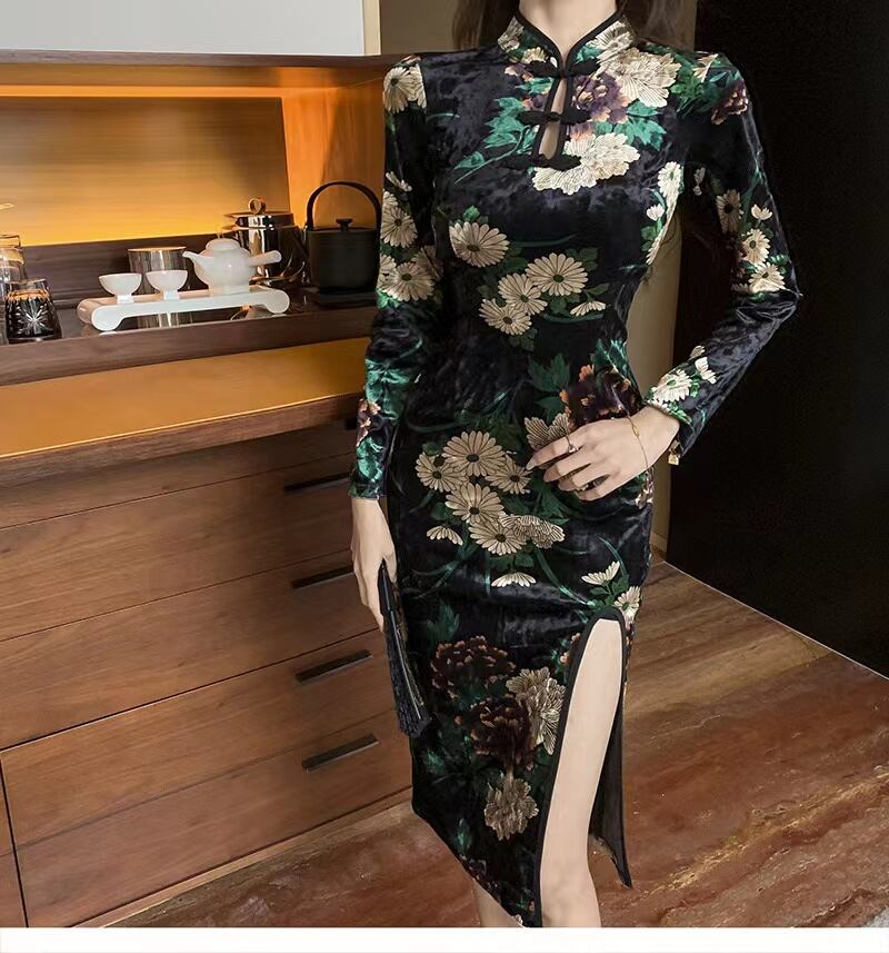 ネックのデザインが特徴的なセクシー黒地の花柄チャイナドレス♪光沢感あり、高級感が溢れるベロア生地の上質な大人のドレス!!脚魅せのハイスリットがセクシー◎暖かい長袖もワンPOINT♪着心地がいい、ストレッチも効いて楽ちん。ボディラインを美しく見せる大変綺麗なドレスです。