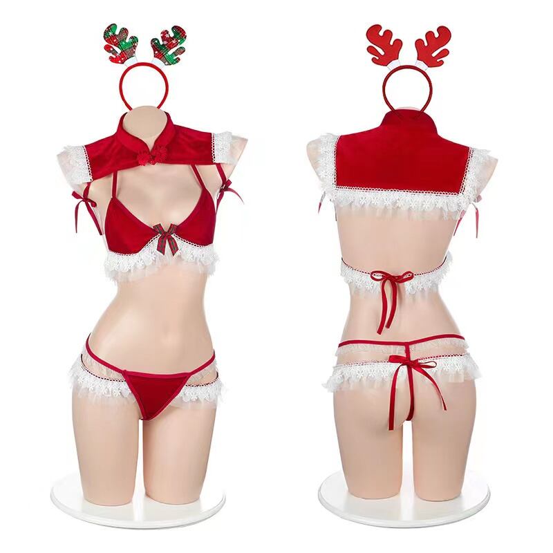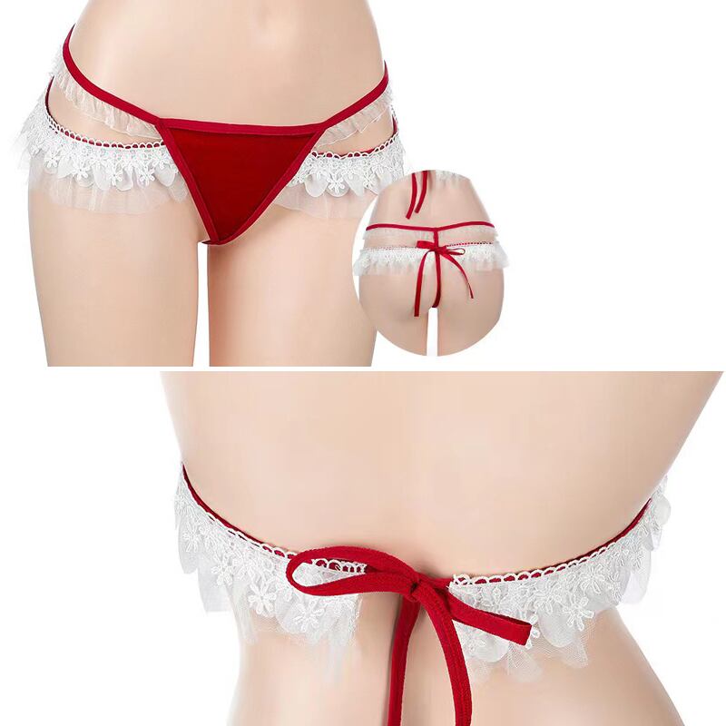 光沢感、高級感のある少し厚めのベロア生地のセクシーサンタ衣装♪ホワイト色の2層レースと刺繍添えが可愛い◎ショーツのバックが結びひもデザインもセクシーさアップ!!