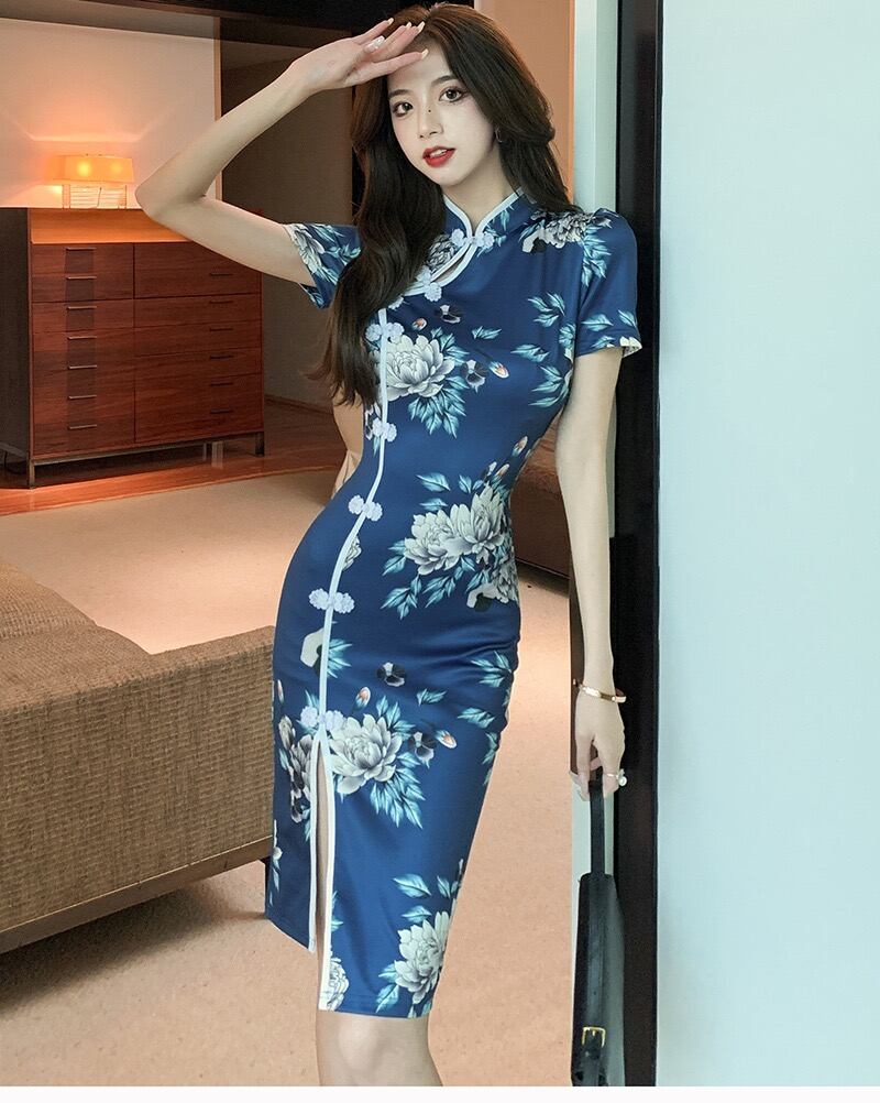 【即納】紺色 ストレッチ チャイナドレス ショート丈【 #[3275_18000]】【送料込み】【251012】