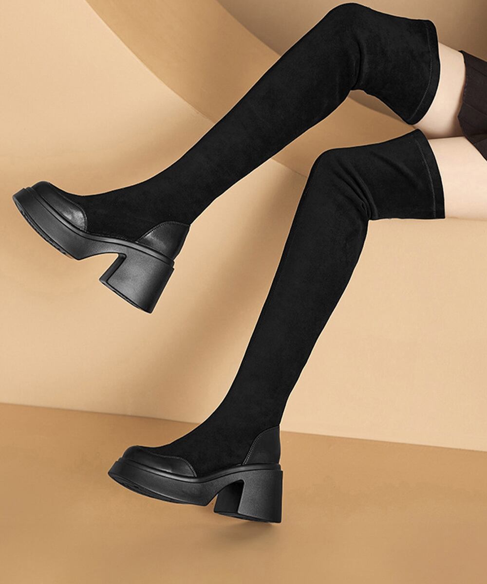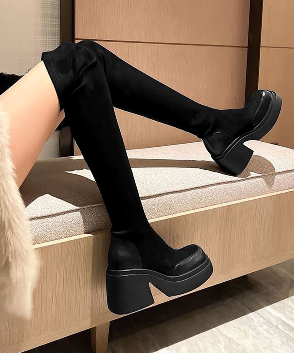 スクエアトゥ 厚底 ジョッキーブーツ 履きやすい膝上ブーツ 美脚脚長ストレッチブーツ大人きれいめ 太ヒールフィットブーツ