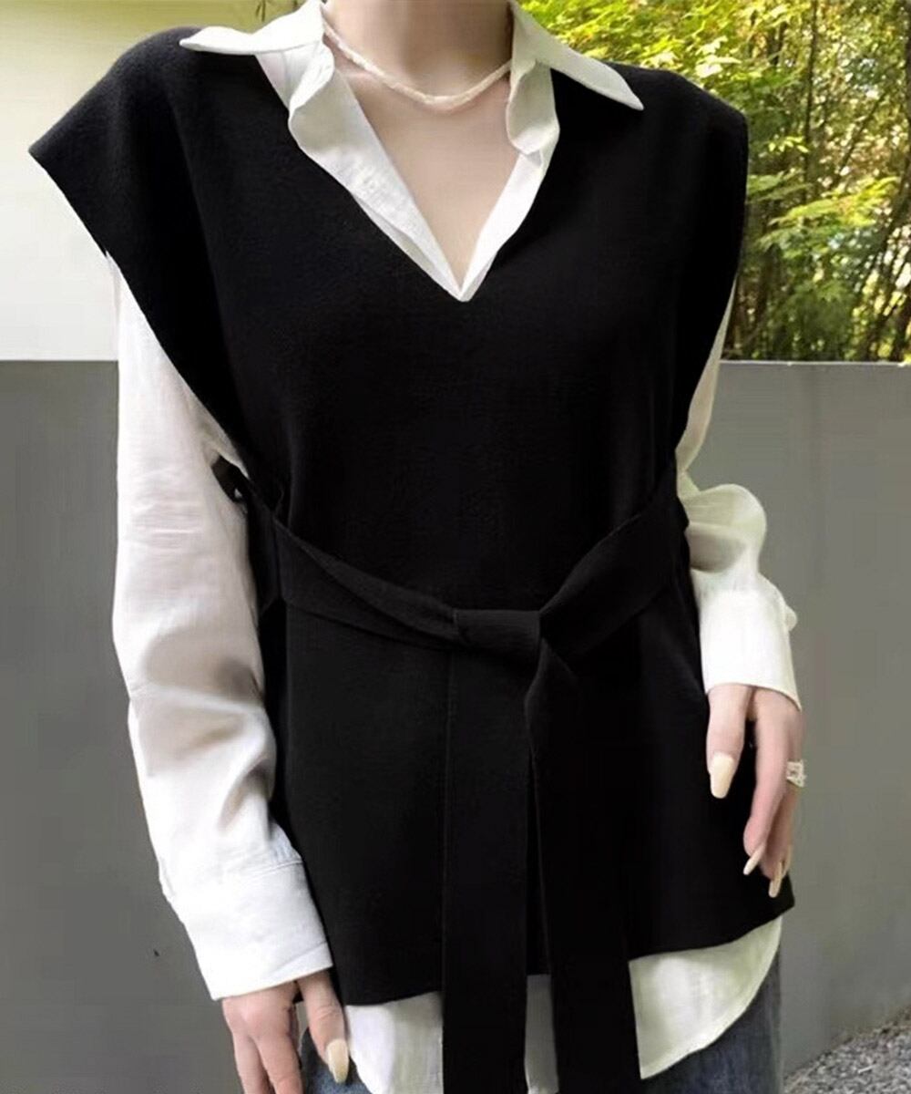 【日本倉庫からの発送】 ベルト付きニットベストニットジレVネック #[21SHANGYI-080_21700]【送料込み】【250712】