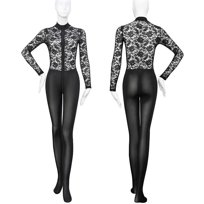 この全身タイツは、洗練された花柄レースデザインが特徴で、エレガントながら大胆な印象を与えます。長袖のデザインとシースルー素材が組み合わさり、魅力的なコントラストを生み出しています。また、フロントには便利な2頭ファスナーが付いており、着脱が非常に簡単です。素材は伸縮性に富み、柔らかく肌触りが良いため、長時間の着用でも快適さを保ちます。