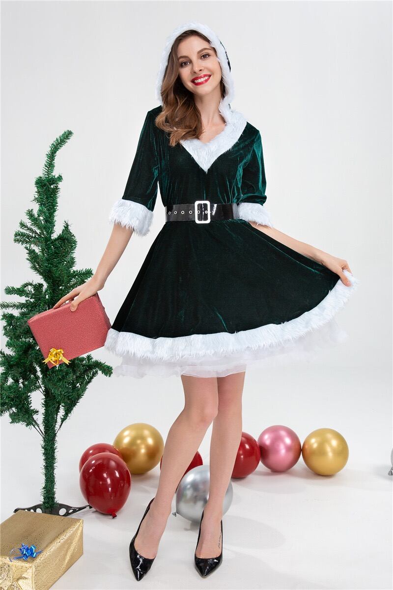高級感のある少し厚めのベロア生地のサンタ衣装、可愛いフード一体型デザイン、レースパニエ内蔵なので、そのままでも美しく着られます!!