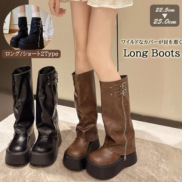 ・ボリュームのある厚底、ワイルドなカバーが目を惹くロングブーツ。