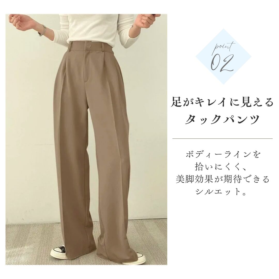 普通のワイドパンツと何が違うの?そう思う方もいらっしゃいますよね。タックパンツは、つまみの入ったパンツの事を指します。このつまみがあることによって、歩いたり座ったりした時に適度に広がってくれます。伸縮性とは違うので締めつけ感が無く、一日中履いても快適にお過ごしいただけます