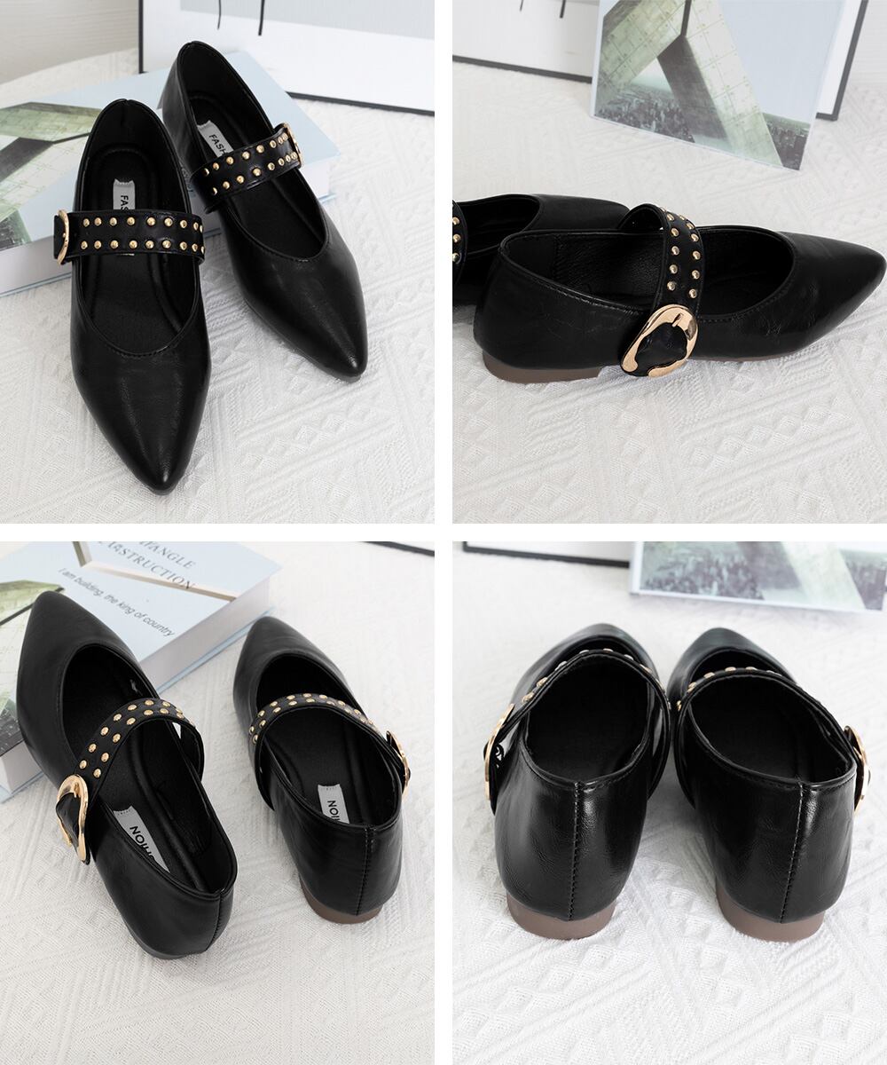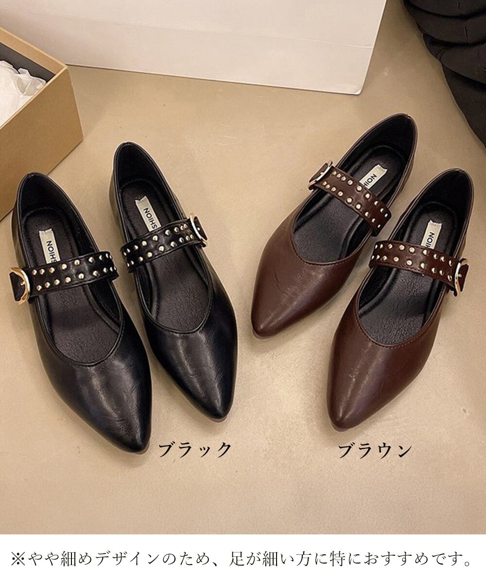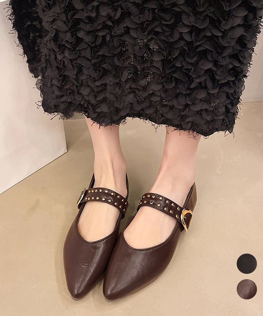 洗練されたポインテッドトゥとスタッズ付きストラップが印象的な、クラシカルモダンなフラットパンプス
