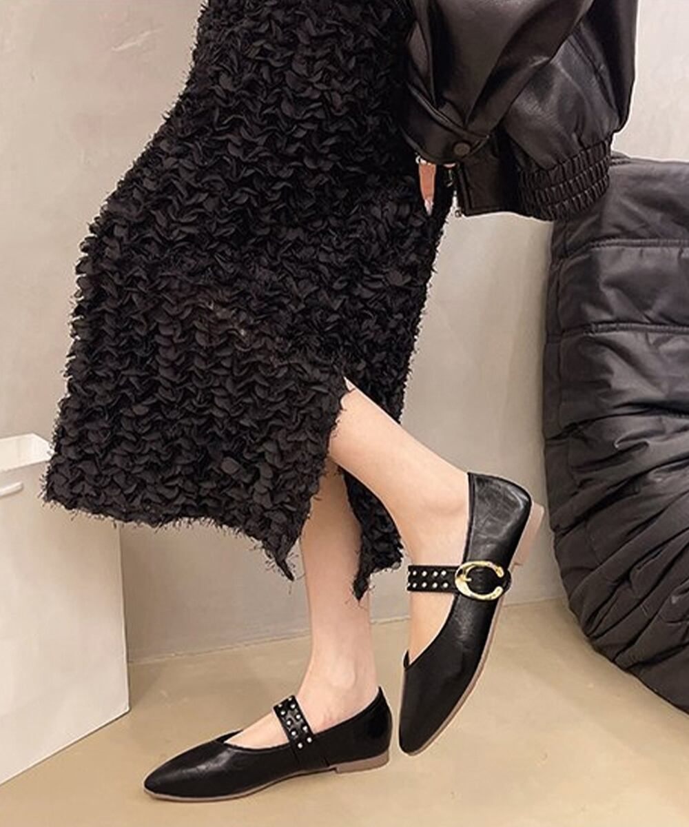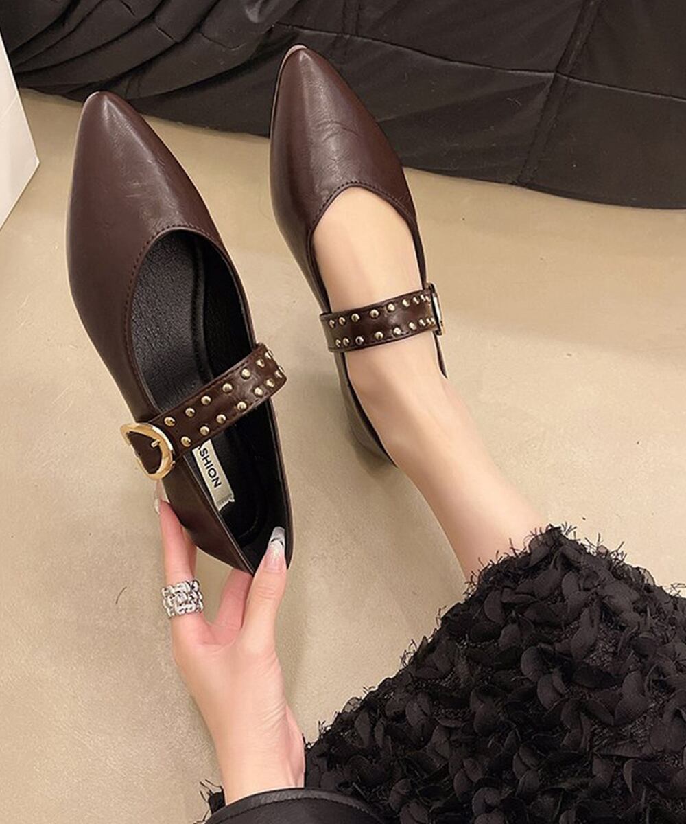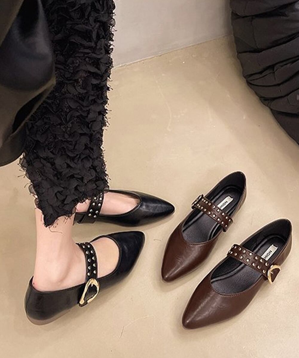 洗練されたポインテッドトゥとスタッズ付きストラップが印象的な、クラシカルモダンなフラットパンプス