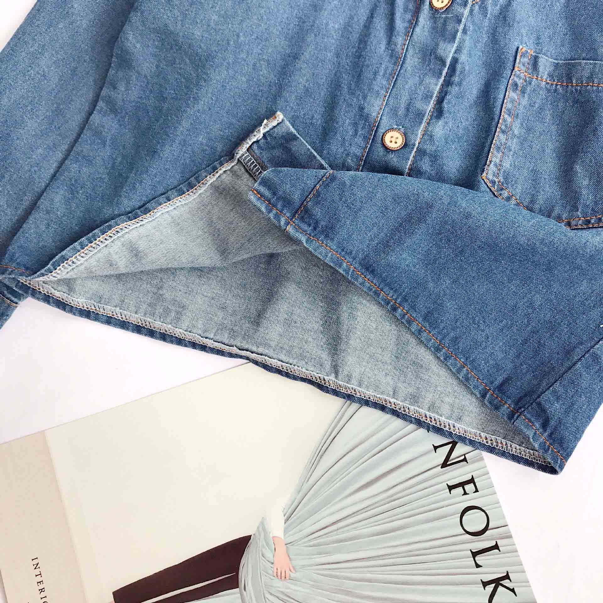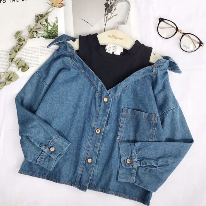 【海外からの取り寄せ】 2025新作 韓国子供服 キッズ デニムトップス 肩出し かわいい 長袖 重ね着風 シャツ 女の子 #[kids828_18800]【送料込み】【250706】