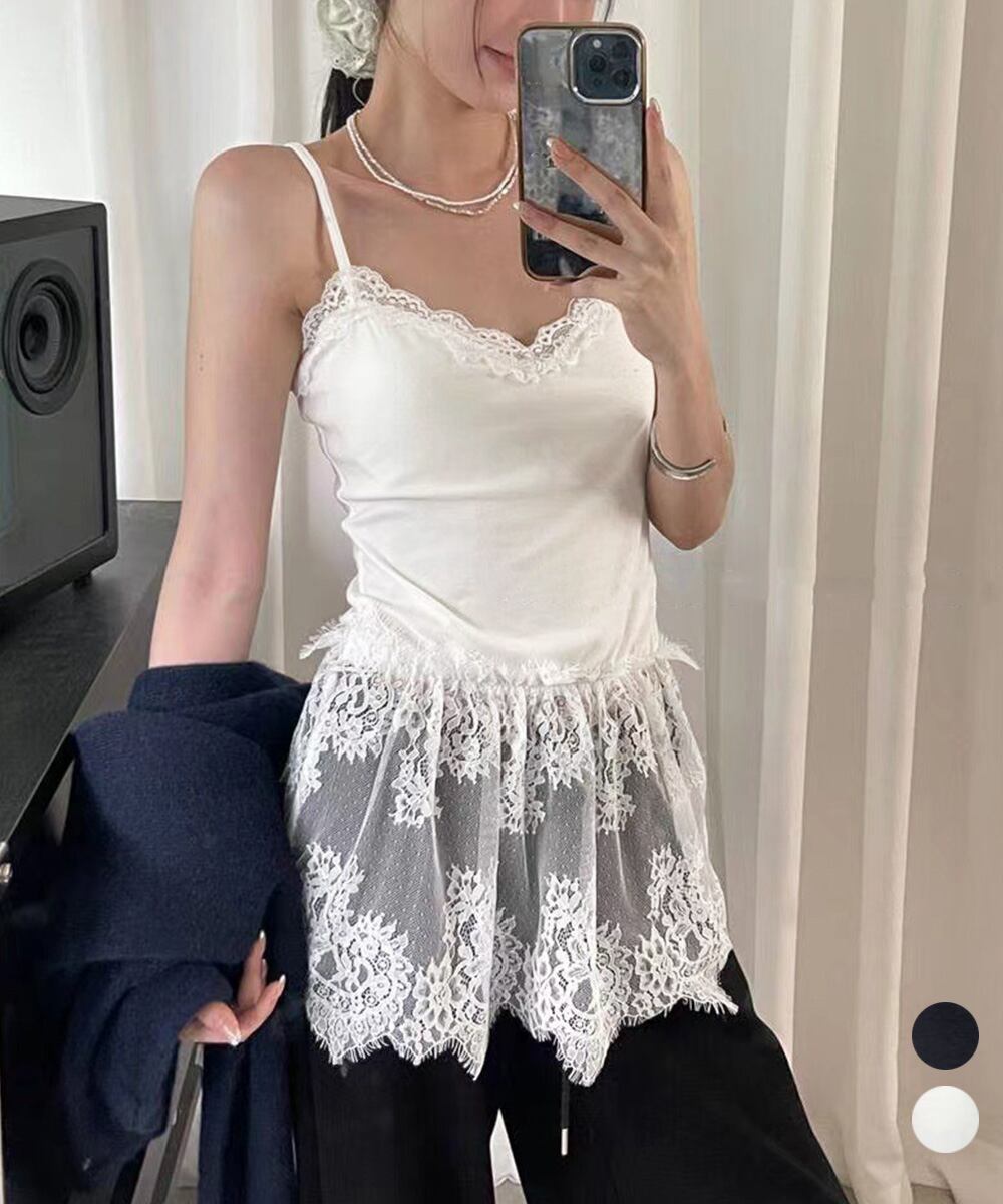 裾のレースデザインがフェミニンで華やかな印象を与えるキャミソール