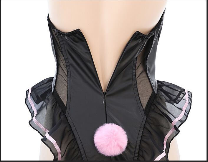 このバニーガールコスチュームは、艶やかなレザー風素材と繊細なフリルのディテールが特徴で、どんなパーティーでも注目の的になること間違いなしです。デザインには、背中に便利なファスナーが付いており、着脱が簡単です。また、ストレッチ性のある素材を使用しているため、様々な体型にフィットし、長時間の着用でも快適です。